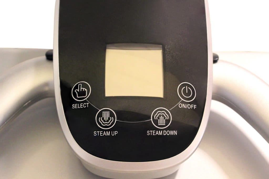 Все кнопки подписаны и снабжены понятными пиктограммами. Правая верхняя — включает/выключает прибор. Левая верхняя предназначена для выбора режимов. Две нижние, как следует из подписей к ним — «Steam Down» и «Steam Up» — активизируют нижнюю и верхнюю подачу пара.