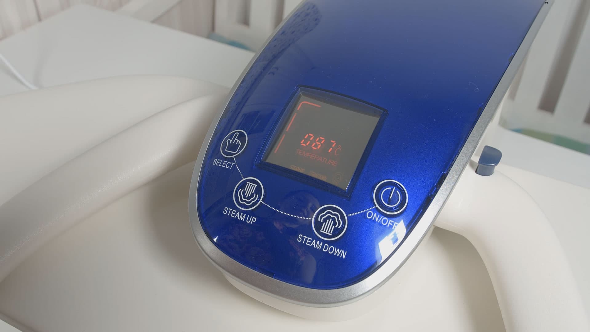 Панель управления расположена удобно. Сенсорные кнопки реагируют адекватно даже при быстрых повторных нажатиях. Цифры, буквы и знаки на электронном дисплее светятся ярко и хорошо видны даже в солнечной комнате. Во время работы на дисплее отображается текущая температура гладильной панели, выбранный температурный режим и подписи выбранных режимов подачи пара. При достижении паром необходимой температуры, рядом с наименованием рабочего режима («Steam Down» и/или «Steam Up») появляется индикатор готовности пара в виде очевидной для восприятия пиктограммы. Когда заканчивается срок службы антиминерального картриджа, на дисплее начинает гореть слово «Cartridge», а под ним — схематическое изображение аксессуара. Все просто и незатейливо.