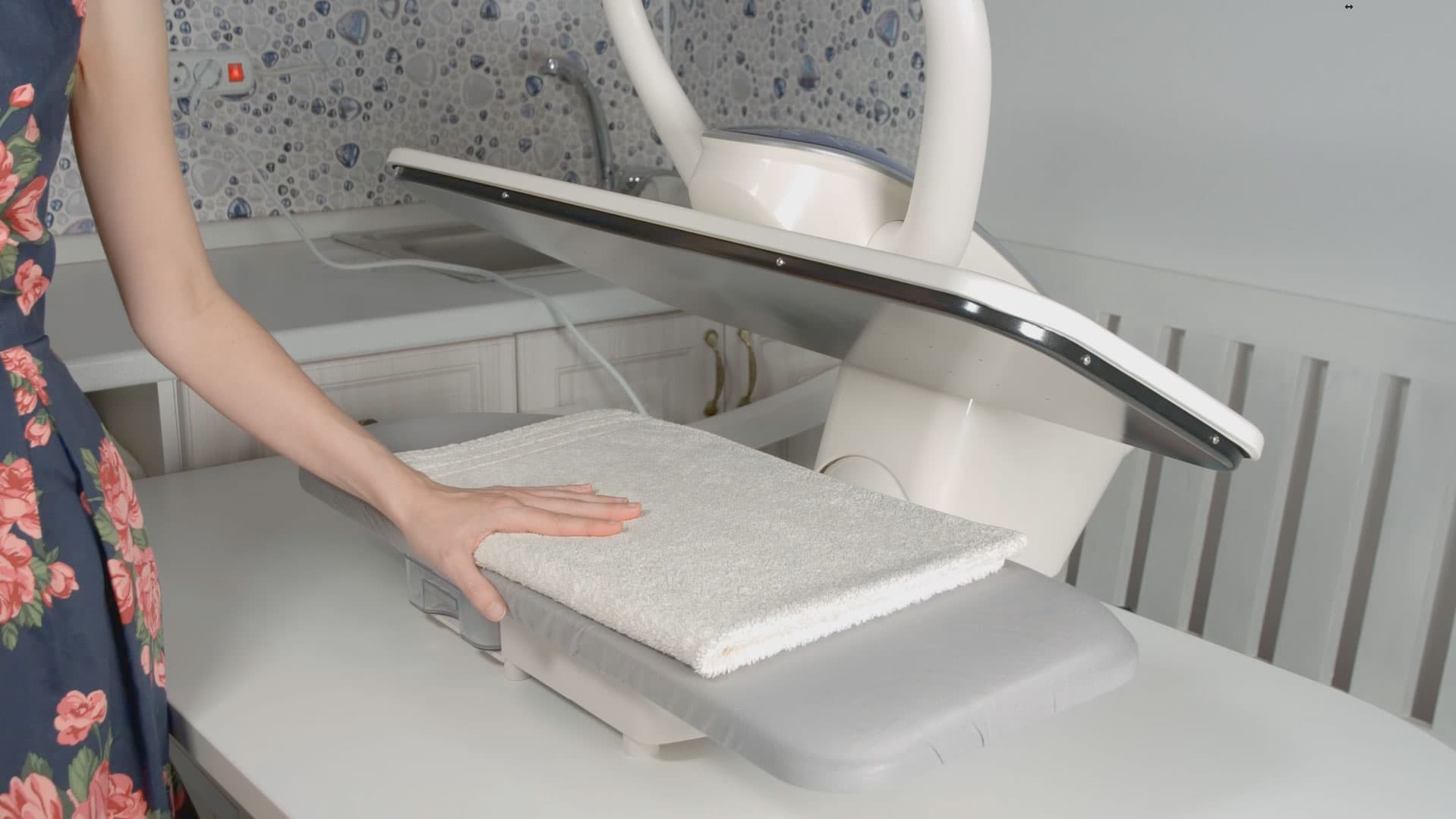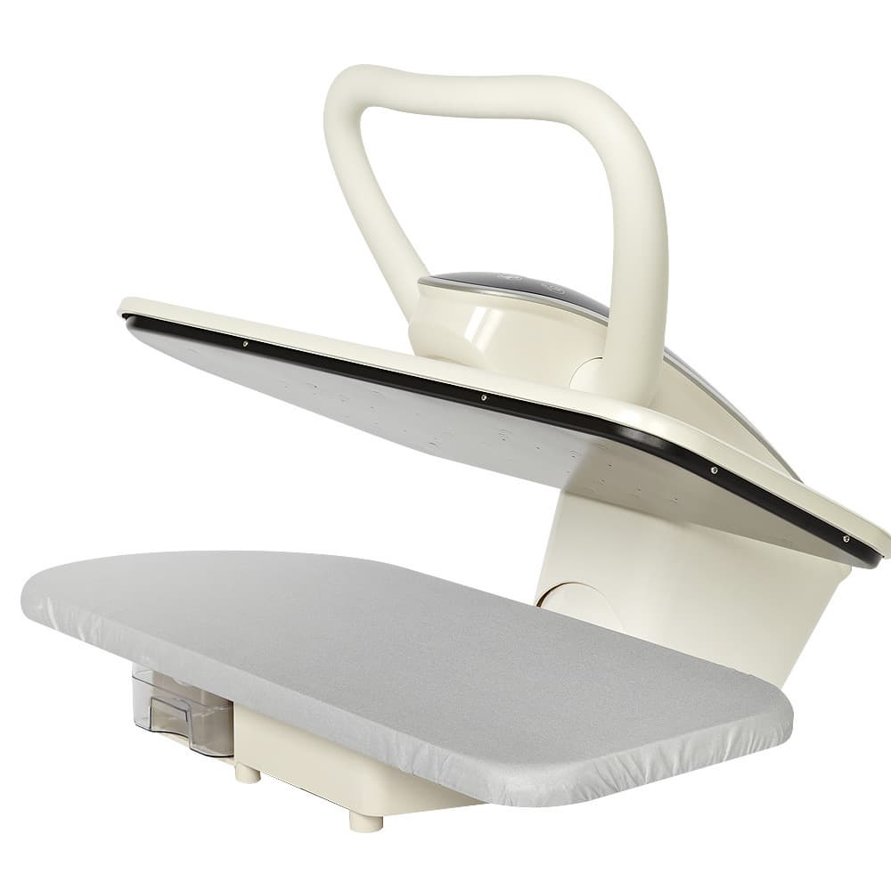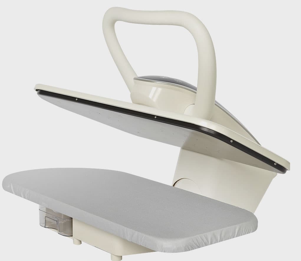 Затем, когда пресс вплотную опускается на гладильную платформу, подача пара приостанавливается, тем самым белье разглаживается и просыхает под воздействием температуры поверхности пресса.