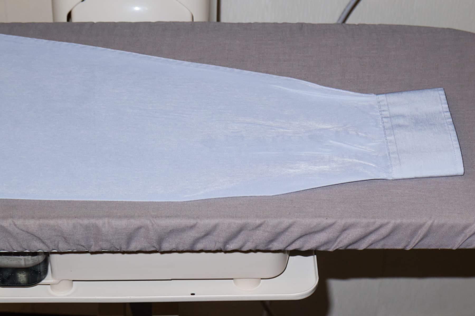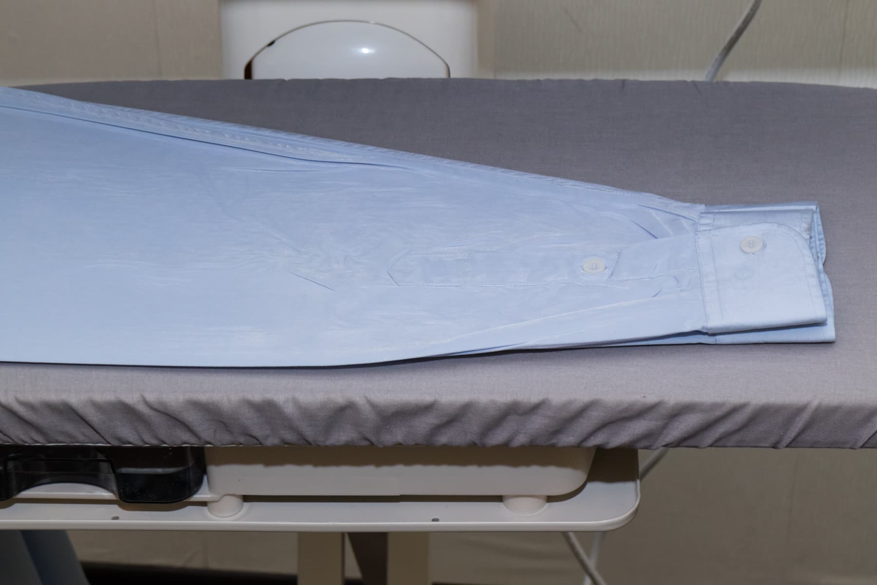 Напоследок мы оставили самую страшную для нас вещь. Гладили рубашку в соответствии со схемой, представленной в инструкции по эксплуатации. Начали с рукавов. Пройму рукава расположили по скошенному краю гладильной доски. Опустили пресс. На внешней стороне нижней части рукава видны следы от складок и пуговиц, расположенных на противоположной стороне.