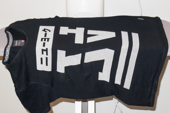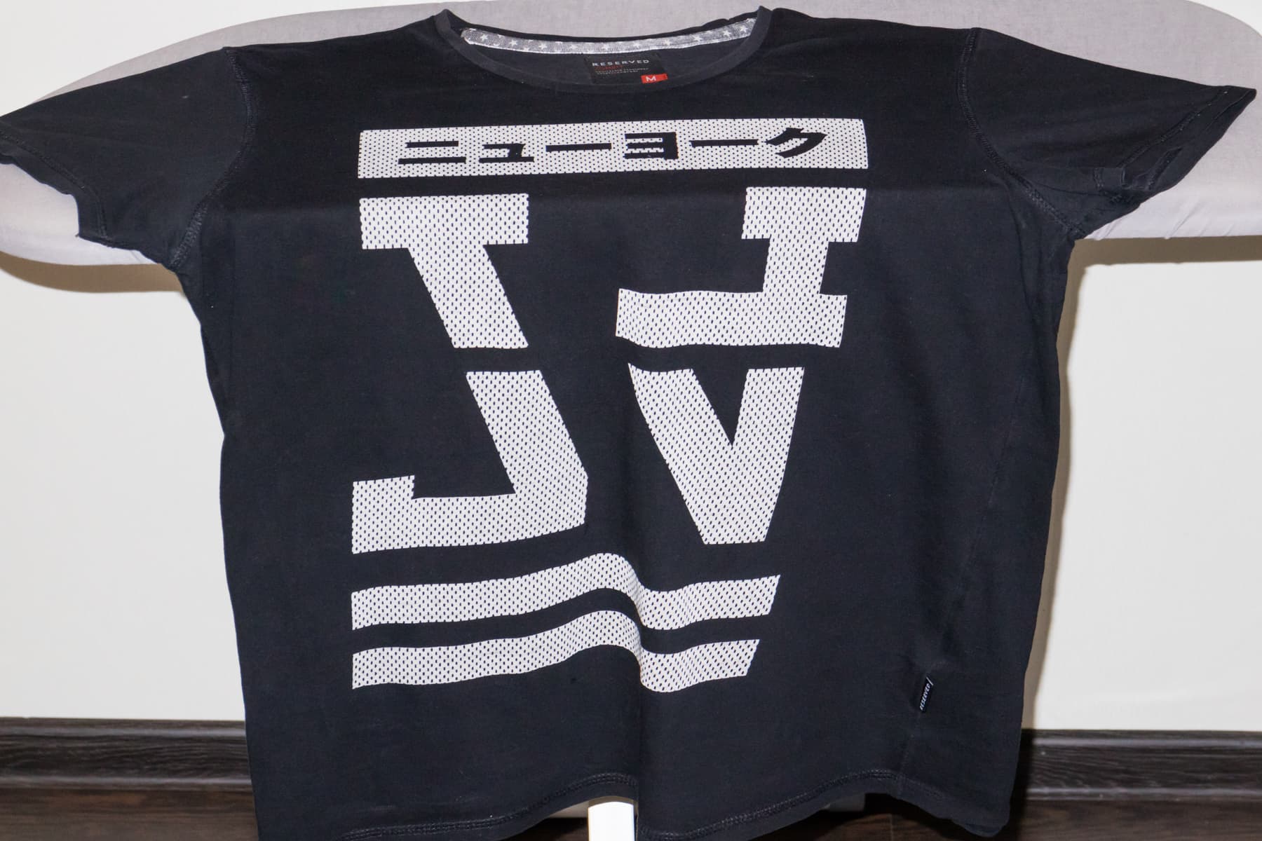 Обработке подверглась обычная хлопчатобумажная футболка с принтованными иероглифами. Гладили в режиме Cotton при верхней подаче пара. Расположили и расправили на гладильной доске футболку, опустили пресс. Затем развернули неглаженой половиной и расправили ее.