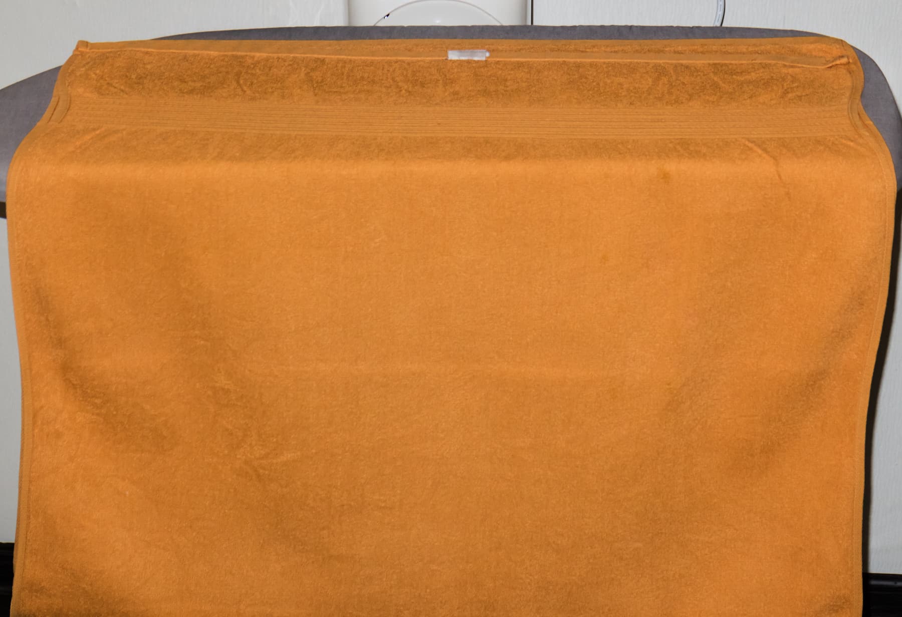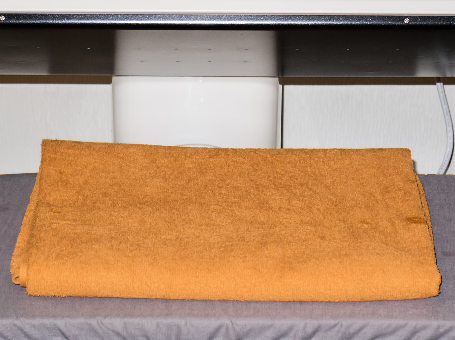 Пересушенное полотенце большого размера, сложенное вдвое, разместили на гладильной поверхности.