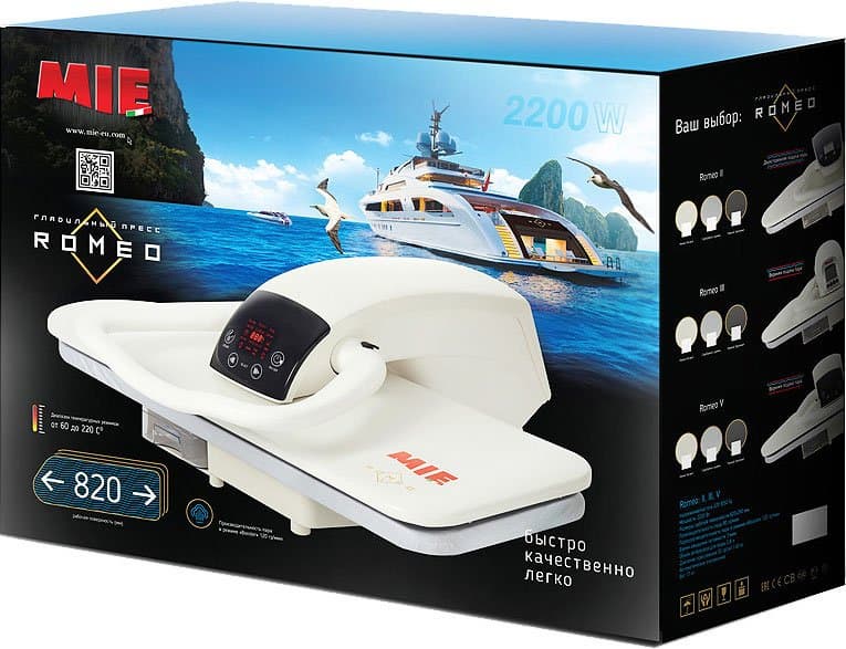 Размер и вес прибора, как видно из таблицы характеристик, довольно внушительны. Поэтому и коробка, в которой поставляется гладильный пресс MIE Romeo II, также производит серьезное впечатление: большая и тяжелая. Коробка изготовлена из плотного глянцевого картона. На фронтальной стороне приведена фотография самого устройства на фоне моря, яхты и летящих чаек. Образы вполне прозрачные, символизирующие, по-видимому, свежесть чистого белья, легкость жизни и простоту глажения при помощи пресса. На боковой стороне представлены фотографии, варианты цветового решения и характеристики трех моделей гладильных прессов: Romeo II, Romeo III и Romeo V.