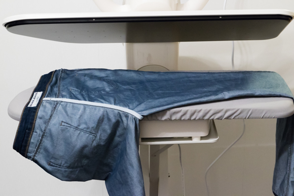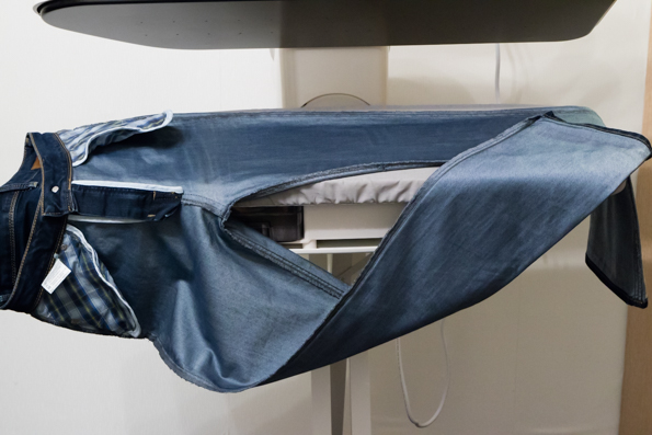 В общем-то, все хорошо, и джинсы могут быть разглажены за четыре раза опускания пресса, но чудес все-таки не бывает. Во-первых, данные джинсы изготовлены из толстой ткани, поэтому в режиме подачи пара сверху мы обрабатывали их с двух сторон. Во-вторых, если гладить действительно за четыре движения пресса, то на боковых сторонах джинсов остаются явные следы глажения в виде стрелок. По этой причине сначала мы хорошо расправляли и обрабатывали одну половину штанины, а затем переворачивали и укладывали вторую половину так, чтобы сгиб приходился на шов, и опускали пресс еще раз.