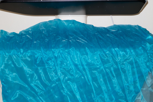 Гладить его в два слоя было трудно, потому что ткань соскальзывала и не позволяла тщательно расправить складки с нижней части. Поэтому, включив режим Nylon, укладывали органзу в один слой. Пар при данном тепловом режиме вырабатывается только со стороны нижней панели, мощность струи при этом довольно мала. Ткань разглаживалась плохо. Увеличили температуру до режима Silk. Пар пошел с двух сторон и более интенсивно. В этом случае нам удалось разгладить органзу до более приемлемого вида.