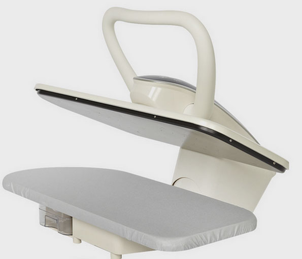 - Крупные вещи размещаются без труда. Широкий угол открывания гладильной поверхности позволяет спокойно подготавливать одежду к разглаживанию, а также складывать одежду по завершении процедуры без риска обжечься.