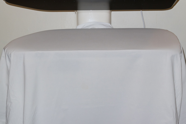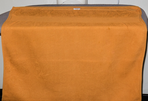 Затем скатали полотенце в неширокий валик и разместили за гладильной поверхностью так, чтобы после обработки ткани вытягивать отглаженный фрагмент на себя, тем самым на доске размещается новый мятый отрезок. Полотенце было приведено в хороший вид за три соприкосновения с гладильным прессом. Обработку производили в режиме Cotton при верхней подаче пара.