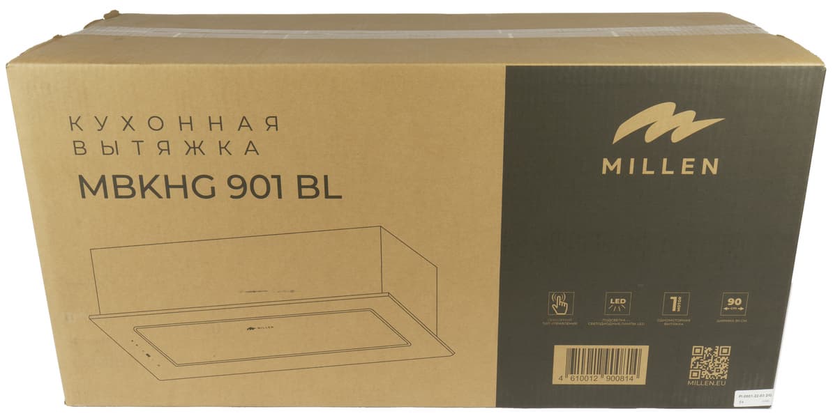 Вытяжка Millen MBKHG 901 BL упакована в коробку из коричневого картона с одноцветной печатью. На передней стороне производитель разместил векторное изображение прибора и перечислил основные его особенности. Это сенсорное управление, светодиодная подсветка, одномоторная конструкция и ширина 90 сантиметров.