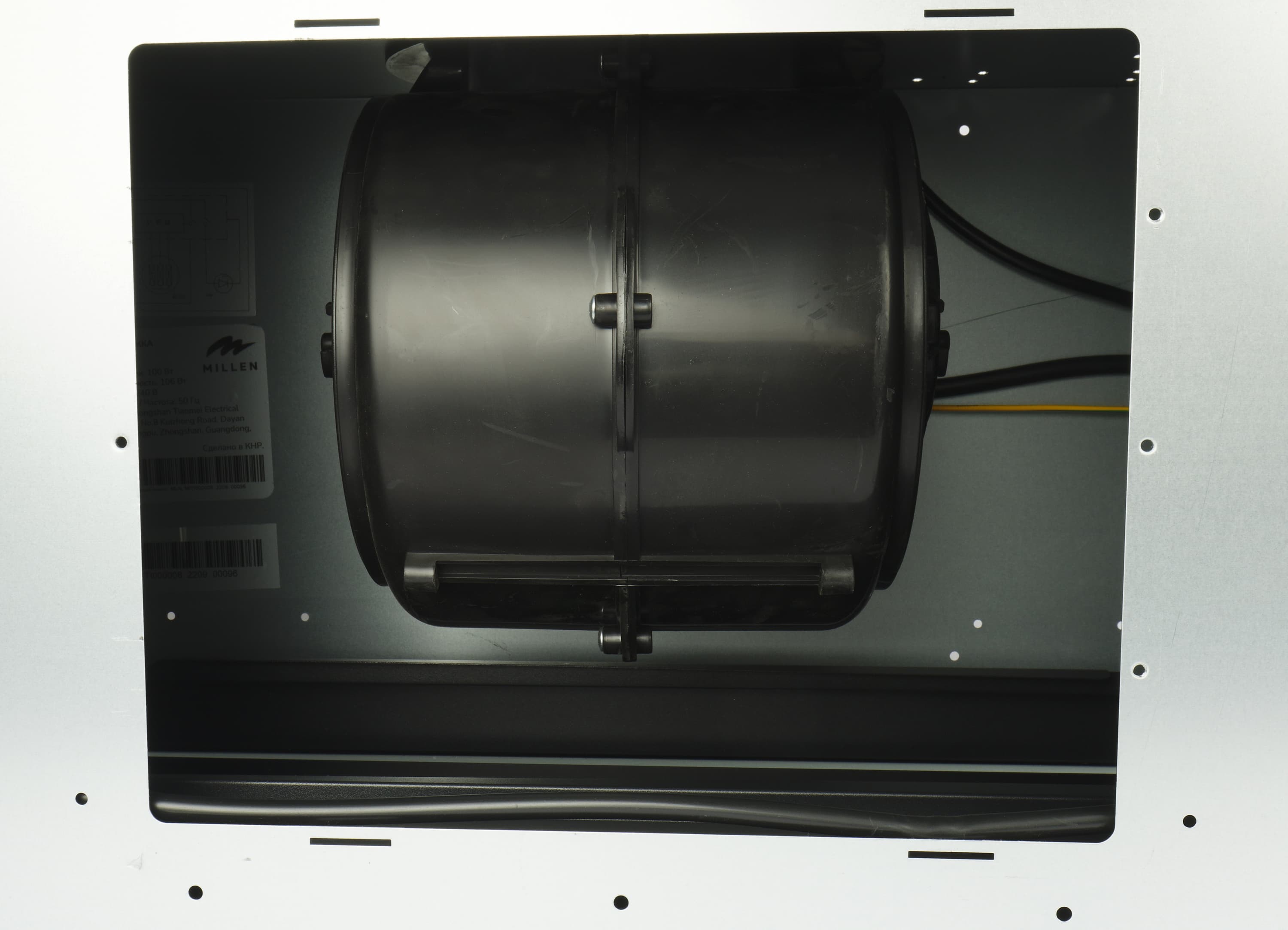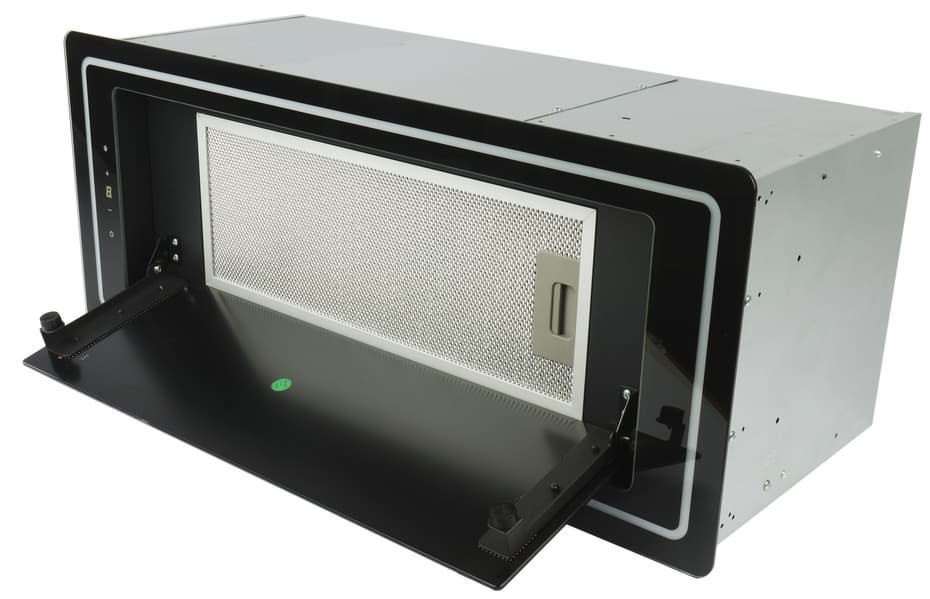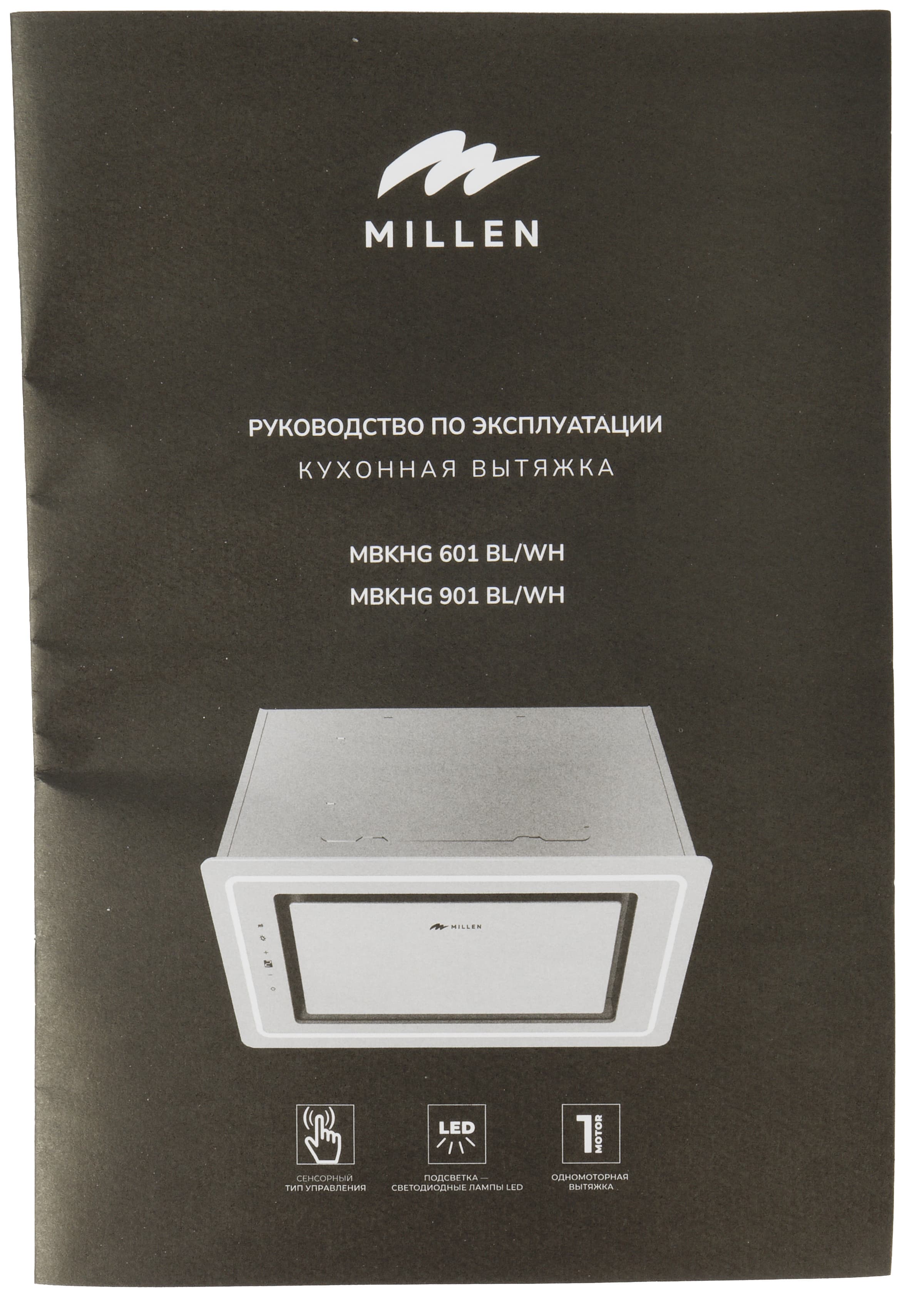 В конструкции Millen MBKHG 901 BL использован единственный мотор. Вытяжка может подключаться к вытяжной вентиляции или использоваться в режиме рециркуляции. В последнем случае на торцевые решетки вентилятора устанавливаются сменные угольные фильтры, которые поглощают неприятные запахи, задерживают пыль и взвешенные в воздухе загрязнения. В комплект прибора они не входят и приобретаются отдельно. Элементы MKF 2 можно купить на сайте производителя.