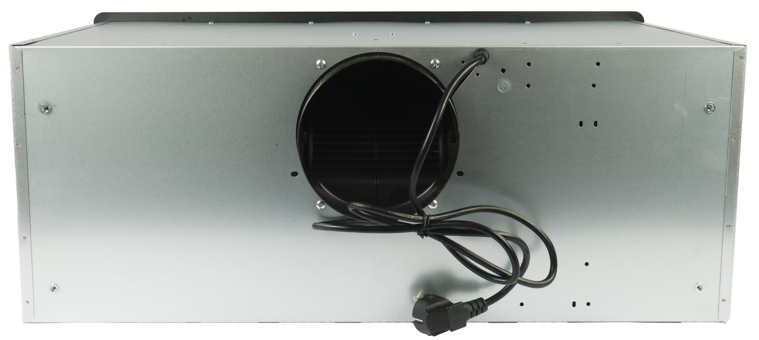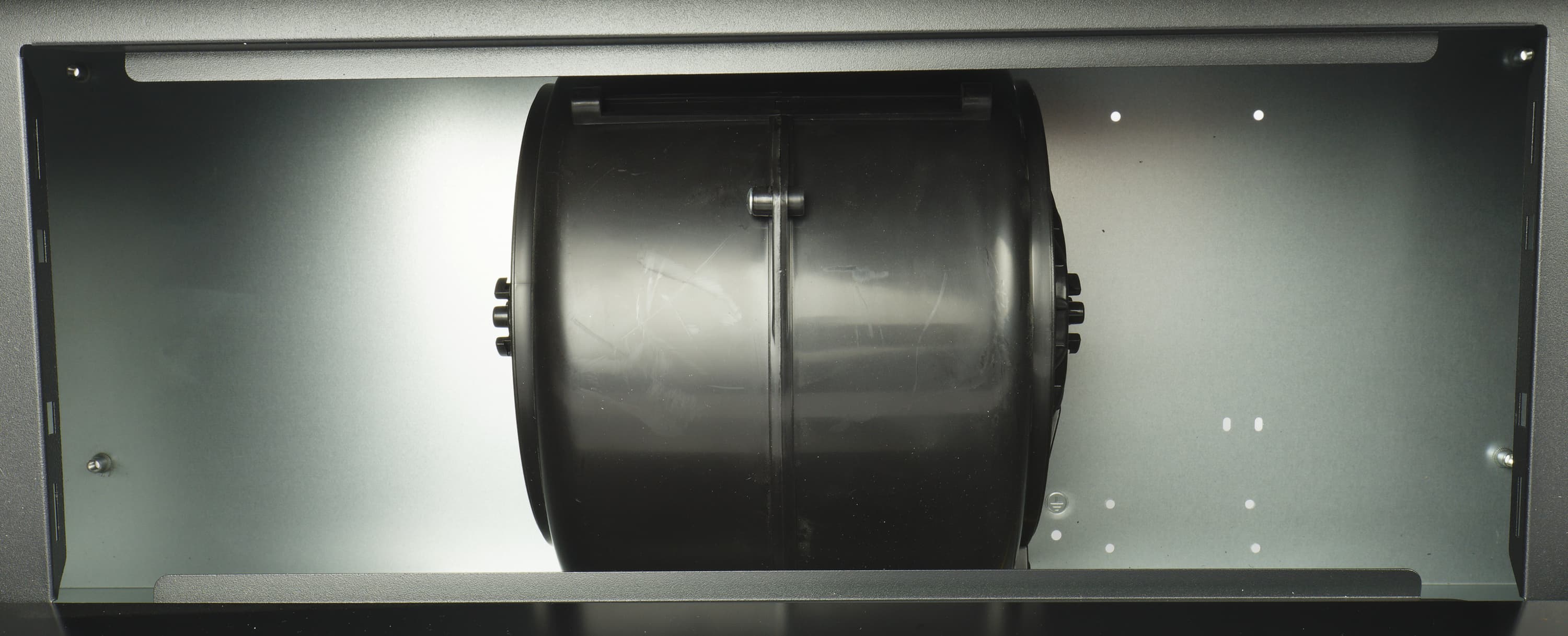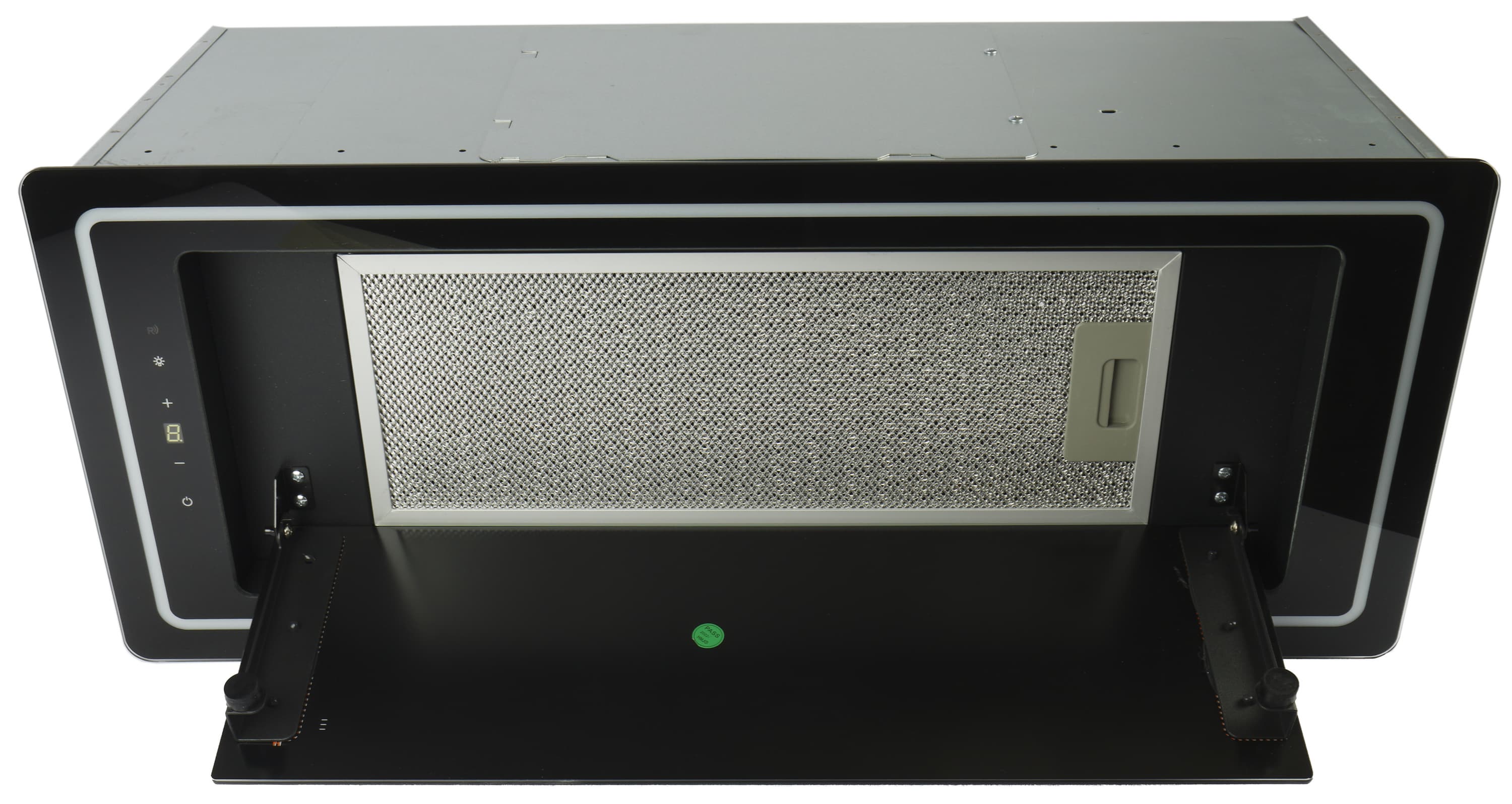Центральная часть панели, украшенная логотипом производителя, представляет собой откидывающийся люк, за которым скрывается антижировой фильтр. Вентиляцию обеспечивает широкая щель между панелью и люком.