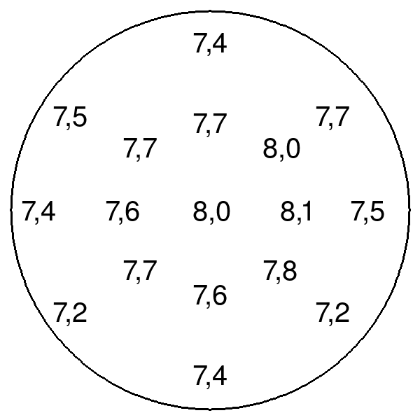 Исходя из полученной средней скорости вычисляется производительность вытяжки в кубометрах воздуха в минуту. Для MBKHG 901 BL результаты измерений выглядели следующим образом (цифры — скорость в метрах в секунду).