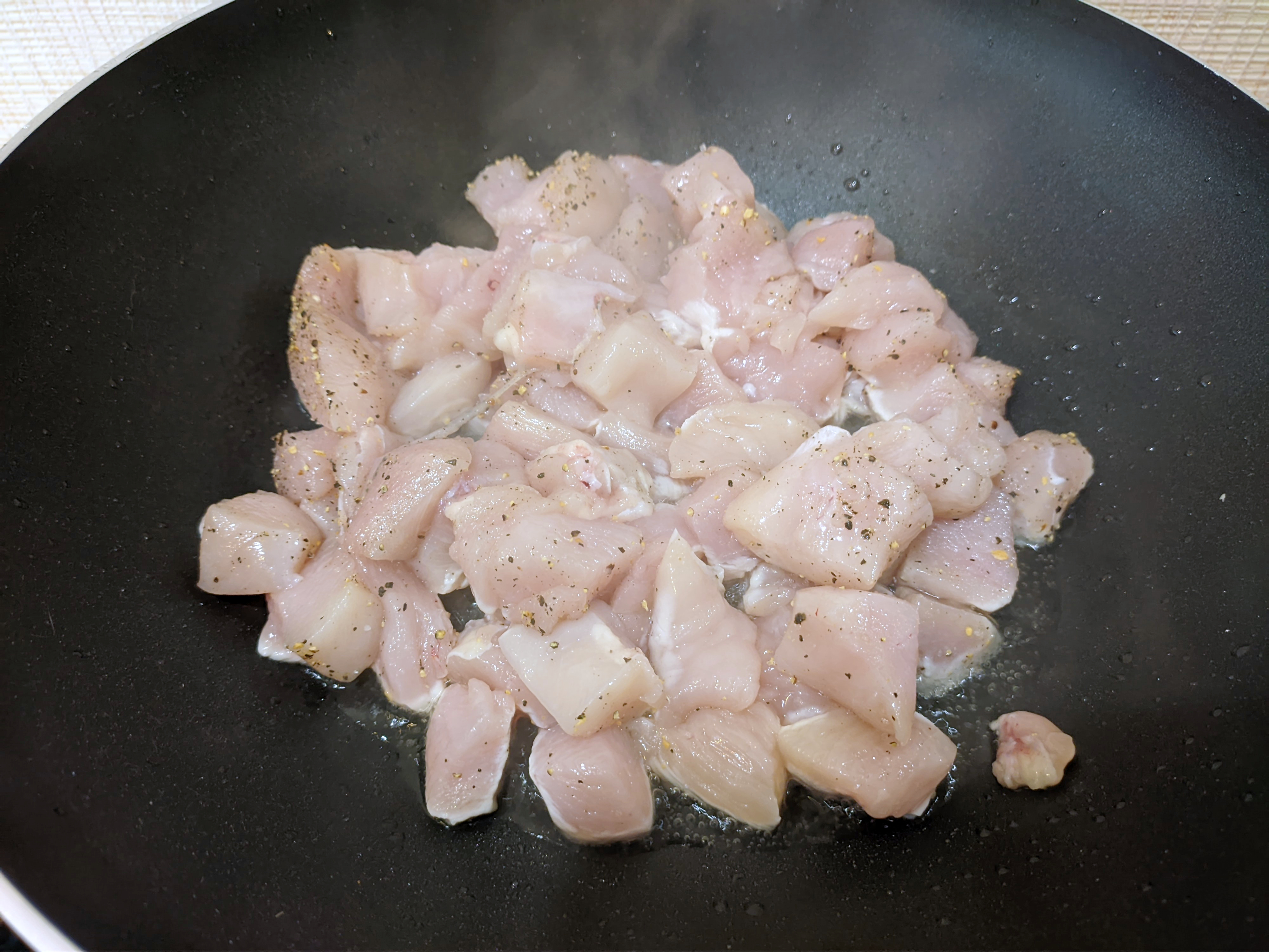 Для начала обжарили кусочки курицы. В первые минуты выделилось заметное количество влаги (подозреваем, что мясо попалось не лучшего качества, нашприцованное водным рассолом).