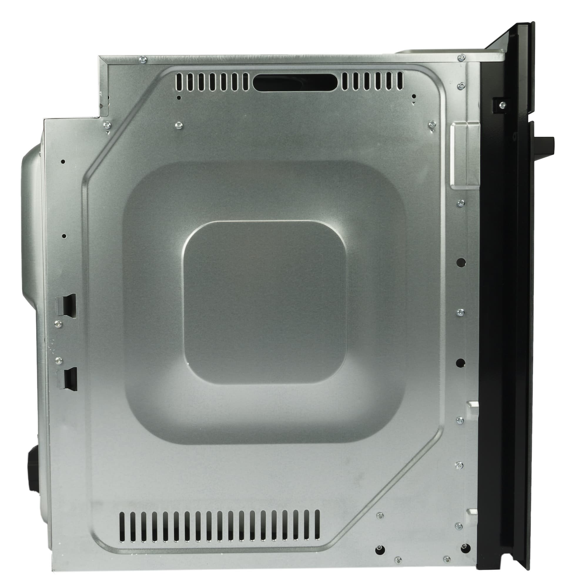 Внутреннее устройство можно назвать стандартным — 73-литровая камера покрыта эмалью, вверху находится тэн гриля, справа в дальнем углу виднеется 25-ваттная галогенная лампа, по центру за решеткой расположен вентилятор, а по бокам закреплены съемные металлические направляющие. Емкости можно размещать на 6 уровнях. Телескопических направляющих в этой модели не предусмотрено.