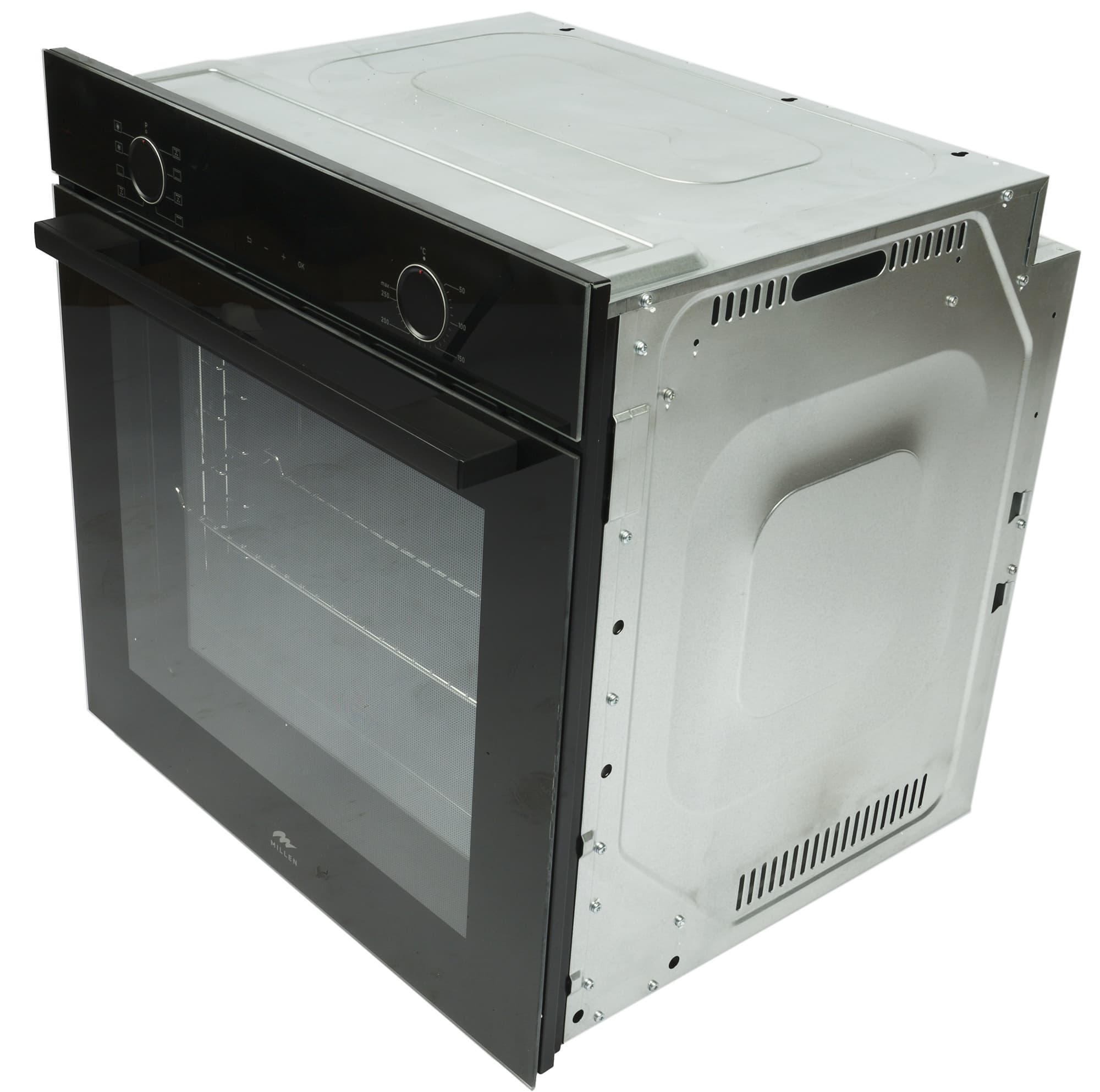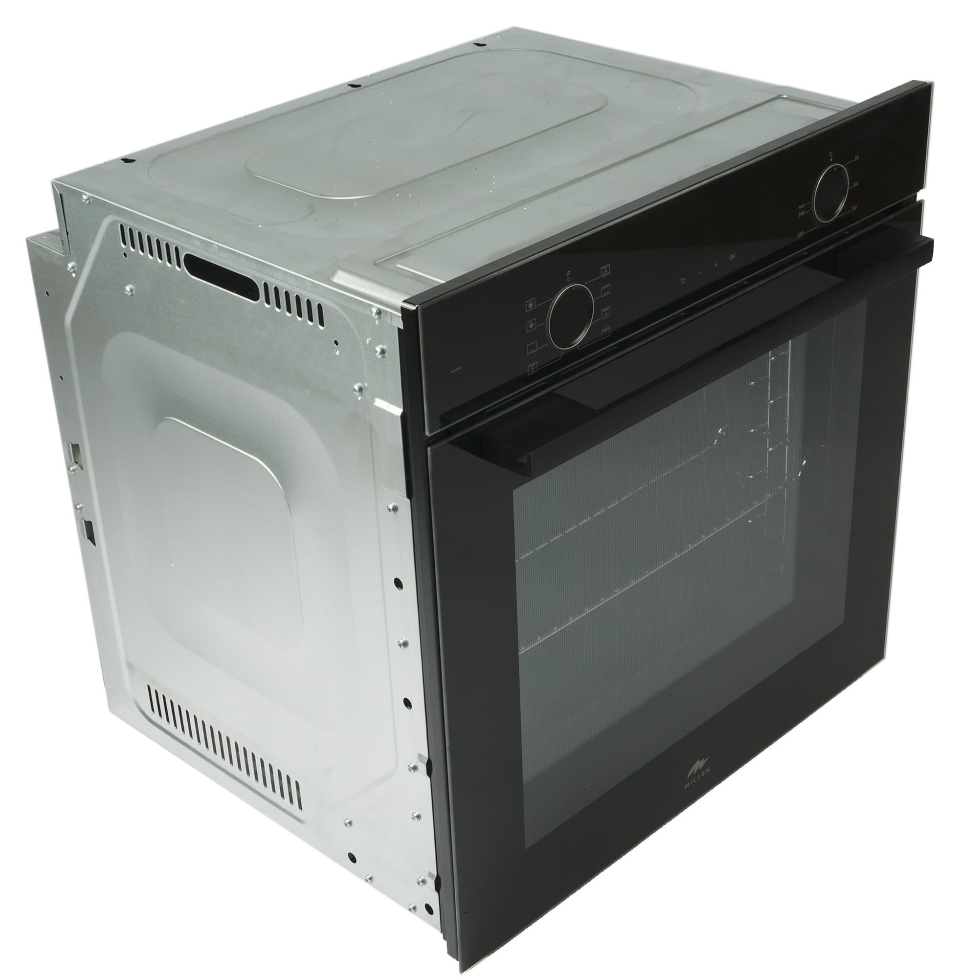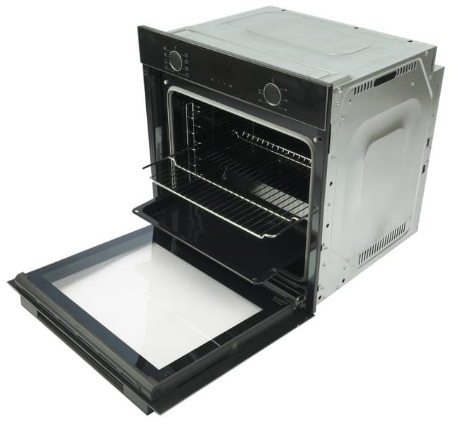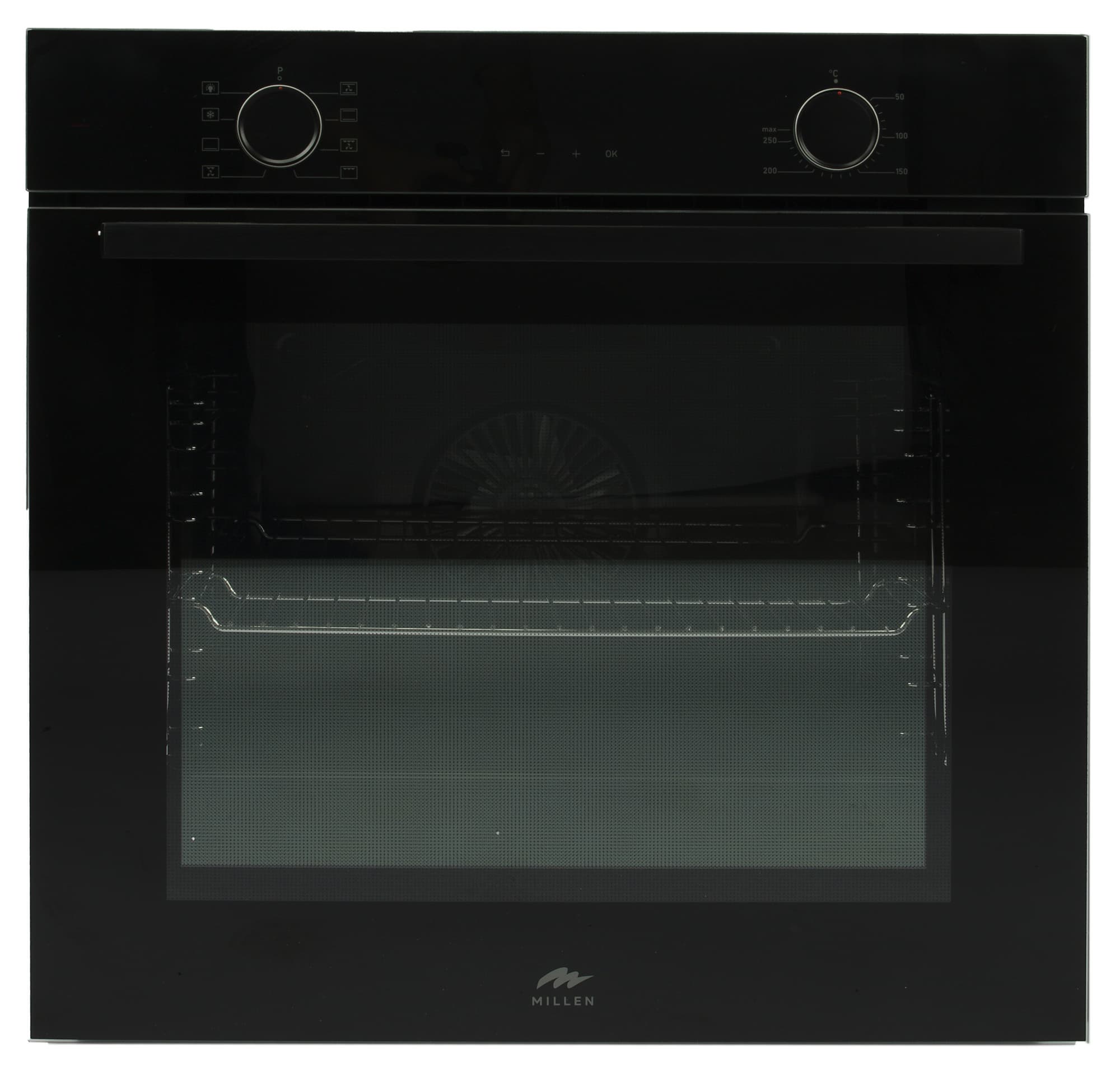 У нас на тестировании духовой шкаф Millen MEO 6002 BB. Эта встраиваемая модель классического черного цвета имеет вместительную камеру на 73 литра с 6 уровнями для размещения противня и решетки, идущих в комплекте.
