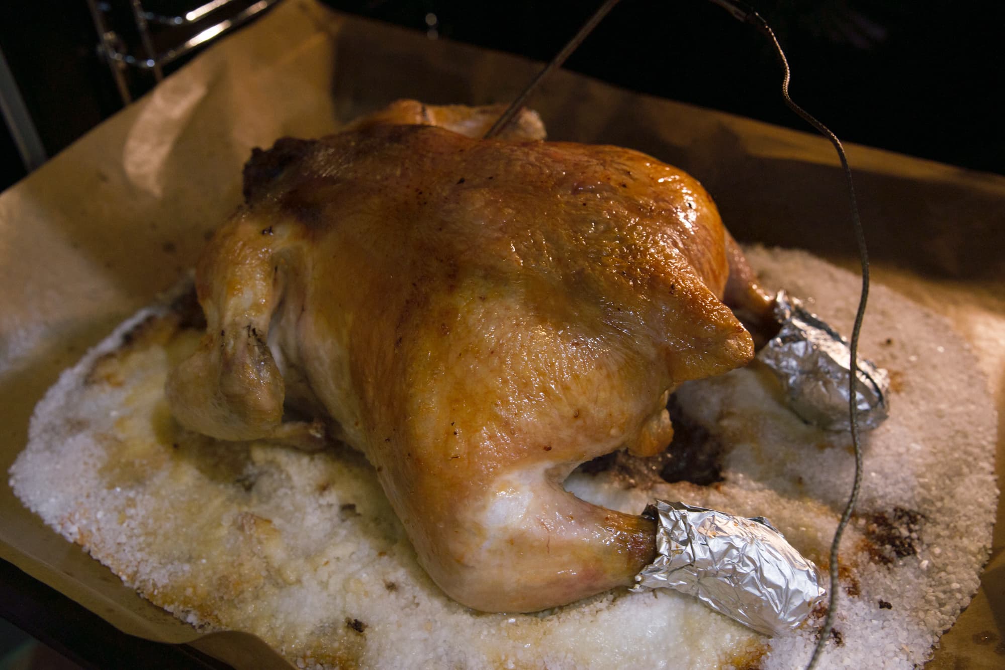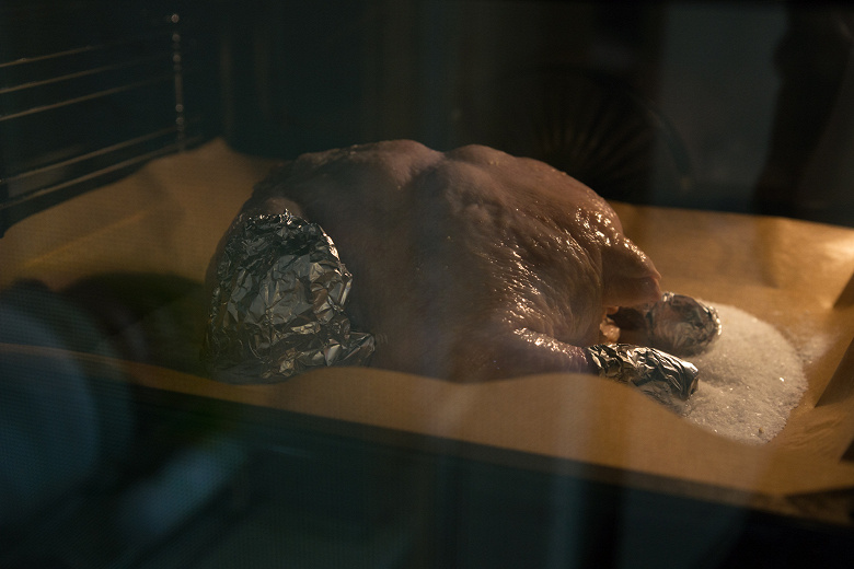Целую курицу весом почти 2 кг решено было не мучить маринадом, а просто уложить на соль и так запекать. Единственное, что мы добавили в этот простой всем известный рецепт — втерли под кожицу измельченный чеснок. Дальше всё просто: на противень высыпали полкило соли, разровняли и сверху уложили птицу (грудкой вниз, так сухое мясо в этой части получается сочнее). Ножки и крылышки защитили от подгорания фольгой.