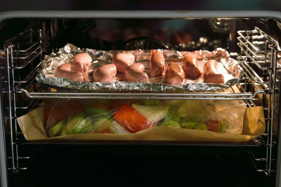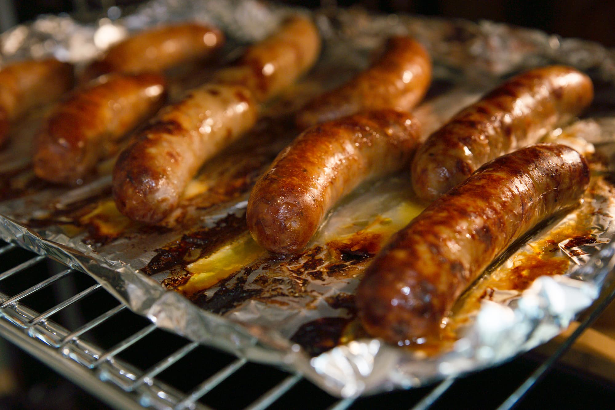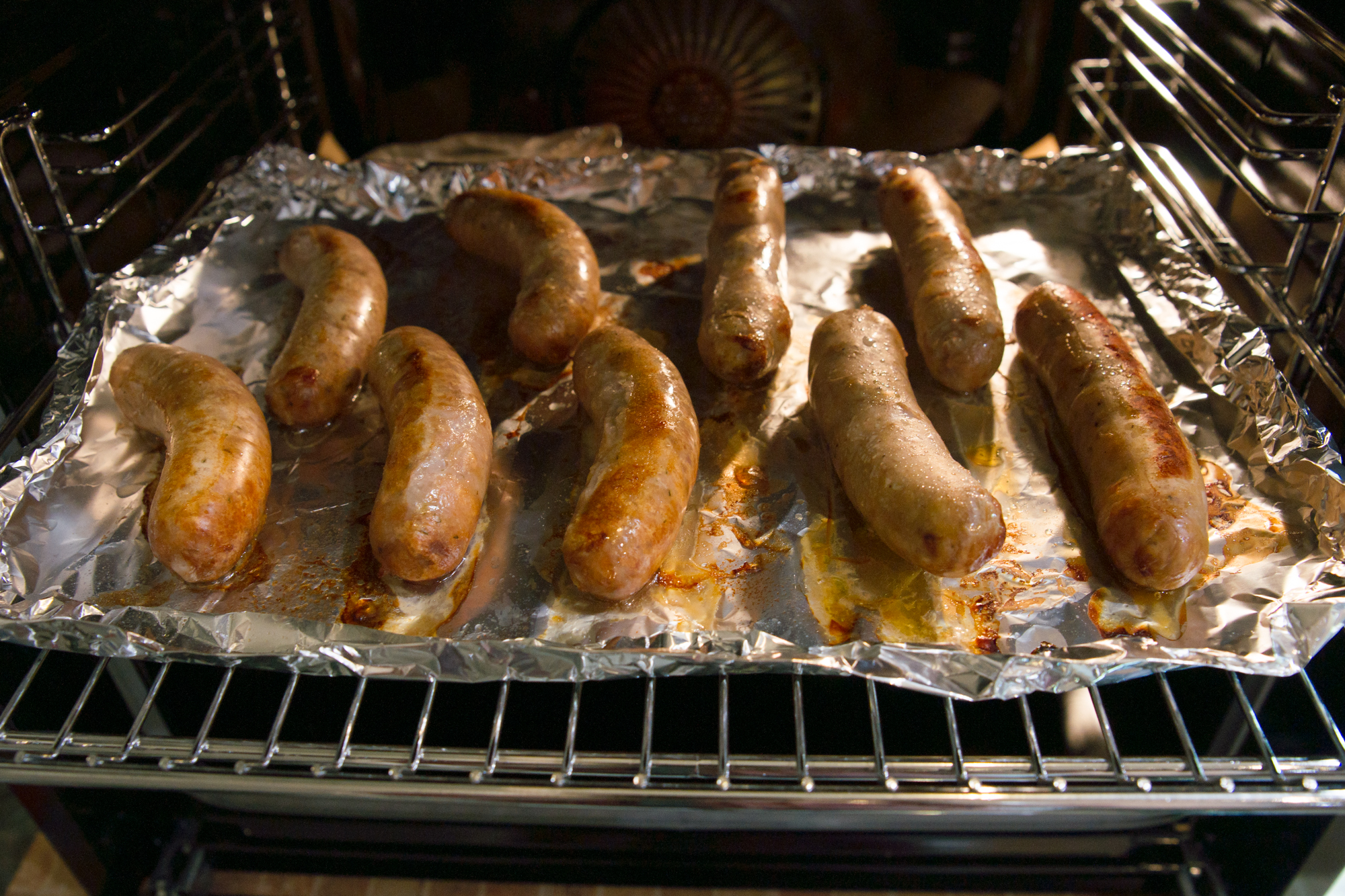 В процессе колбаски один раз перевернули, а дождавшись образования аппетитной румяности, выключили духовку.