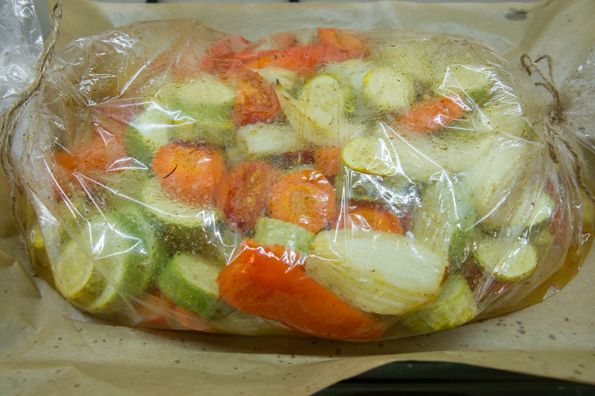 Нарезанные овощи для кабачковой икры посолили, поперчили, смазали подсолнечным маслом, переложили в рукав для запекания, аккуратно встряхнули его и уложили на противень. Чтобы рукав не лопнул при нагревании, сделали несколько проколов зубочисткой. Овощи отправились в разогретую камеру первыми. Духовка работала в режиме верх+низ с конвекцией на 180 °C.
