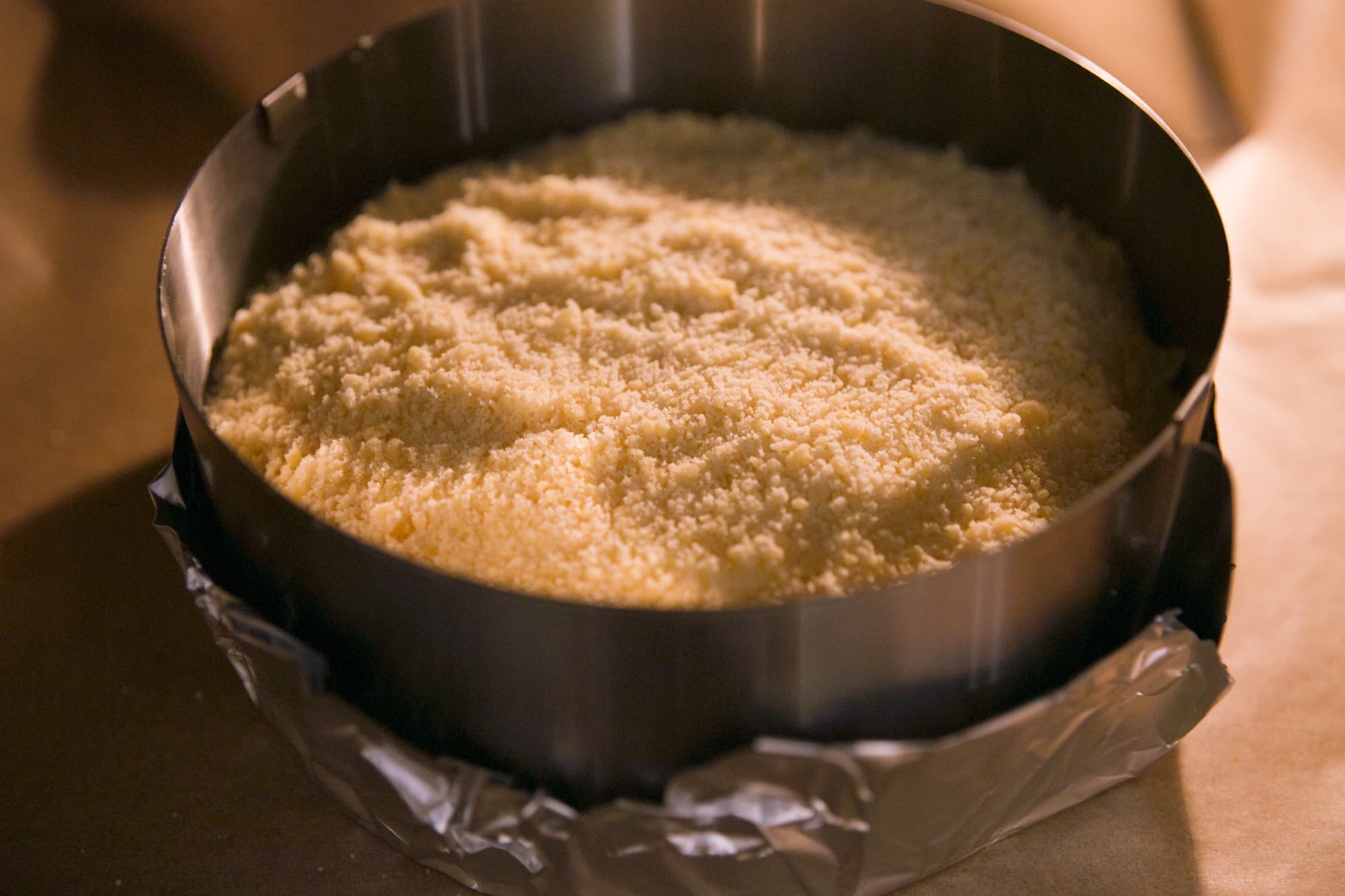 В муку всыпали соль и разрыхлитель, добавили холодное сливочное масло, нарезанное кубиками, и перетерли в крошку. Смешали желтки с сахаром, влили в тесто и тщательно всё еще раз перемешали. Суть в том, чтобы получить крошку, которая легко сминается пальцами. В емкость диаметром 20 см выложили ⅔ теста, сформировав дно и небольшие бортики. После чего убрали заготовку и остатки теста в холодильник примерно на 20 минут.