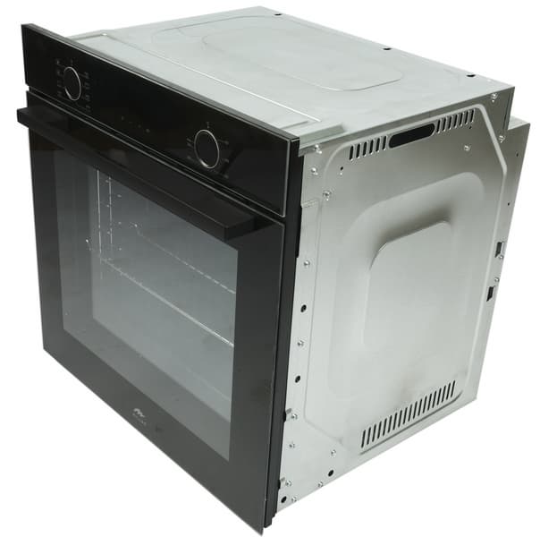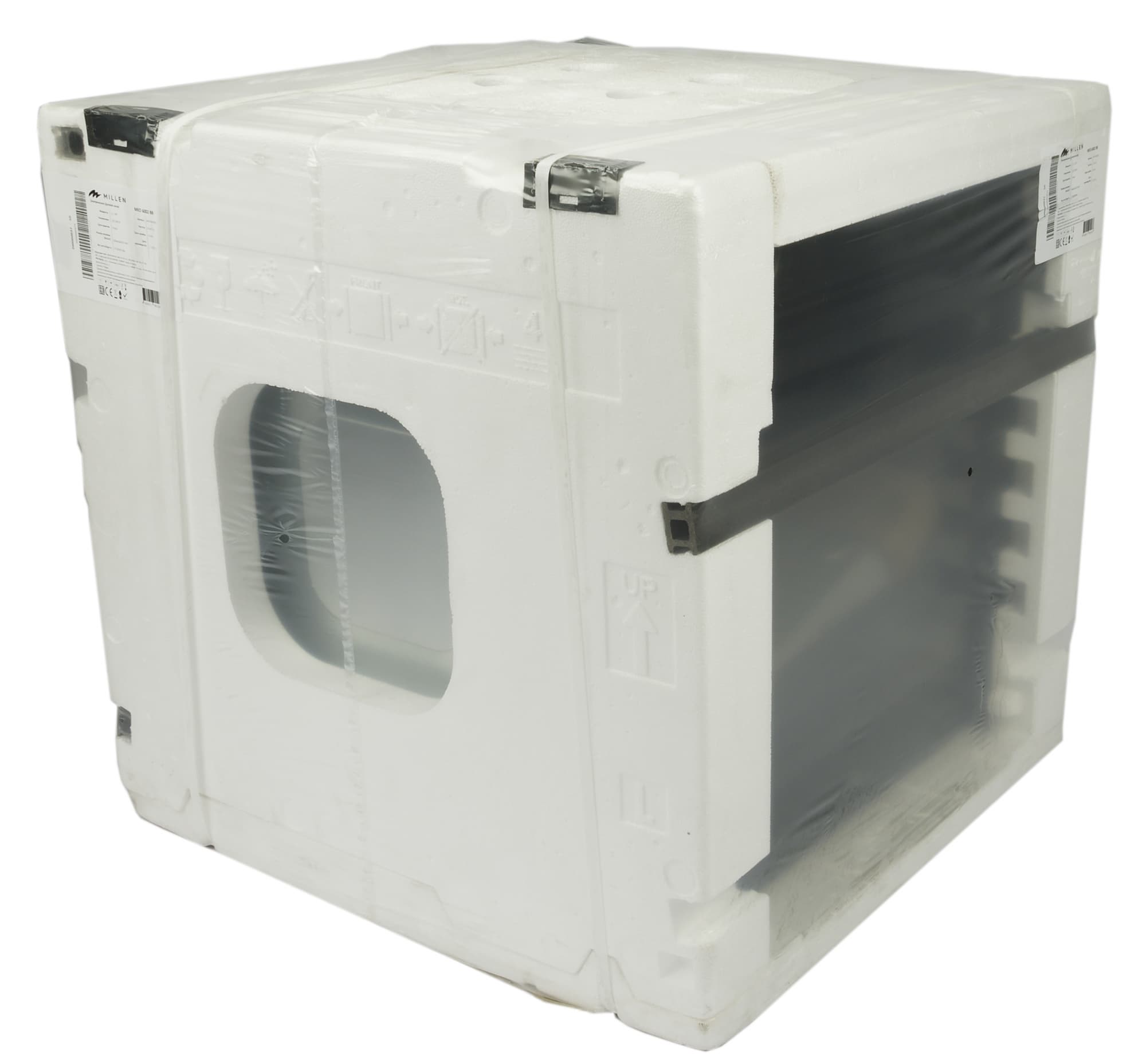 Духовой шкаф Millen MEO 6002 BB появился у нас в лаборатории в пенопластовом коробе, обтянутом полиэтиленом. По центру фронтальной части конструкция усилена прочной пластиковой планкой. Справа вверху размещена наклейка с информацией об устройстве.