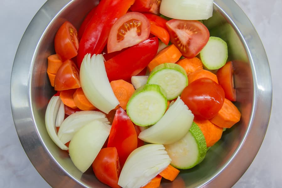 Ингредиенты для икры: кабачки — 1 кг, помидоры — 350 г, красный болгарский перец — 200 г, морковь — 200 г, репчатый лук — 200 г, подсолнечное масло — 3 ст. л., соль и черный молотый перец — по вкусу
