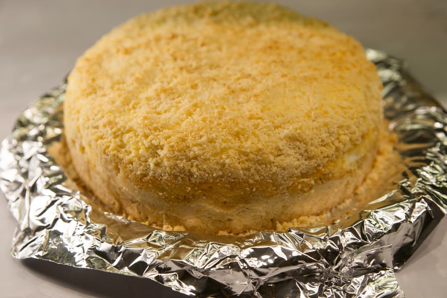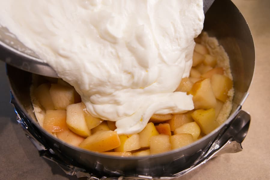 Пока духовка разогревалась до 170 °C в режиме верхнего и нижнего нагрева, мы занялись сборкой пирога. Достали форму с тестом из холодильника и выложили на дно остывшую яблочную начинку. Сверху распределили сметанный крем, разровняли и присыпали оставшейся крошкой.