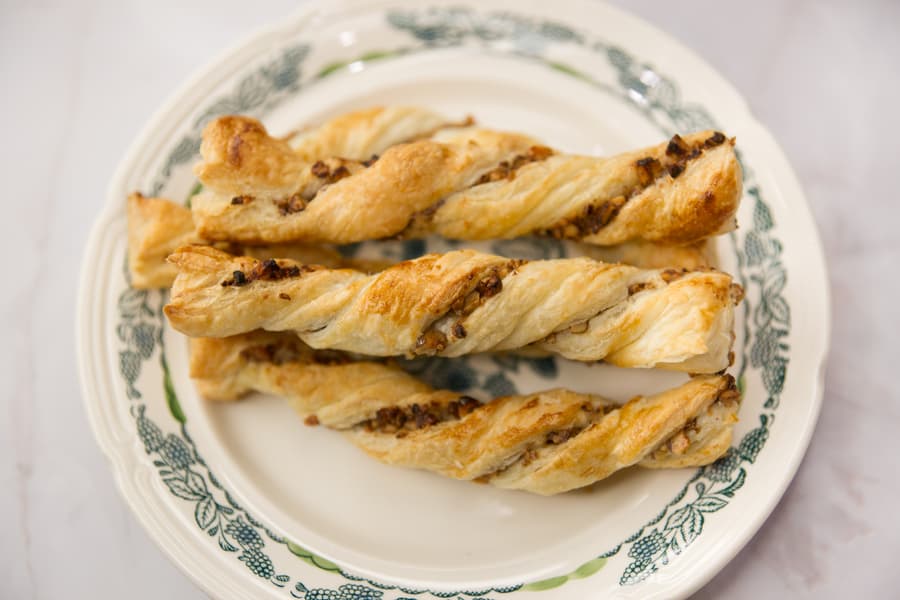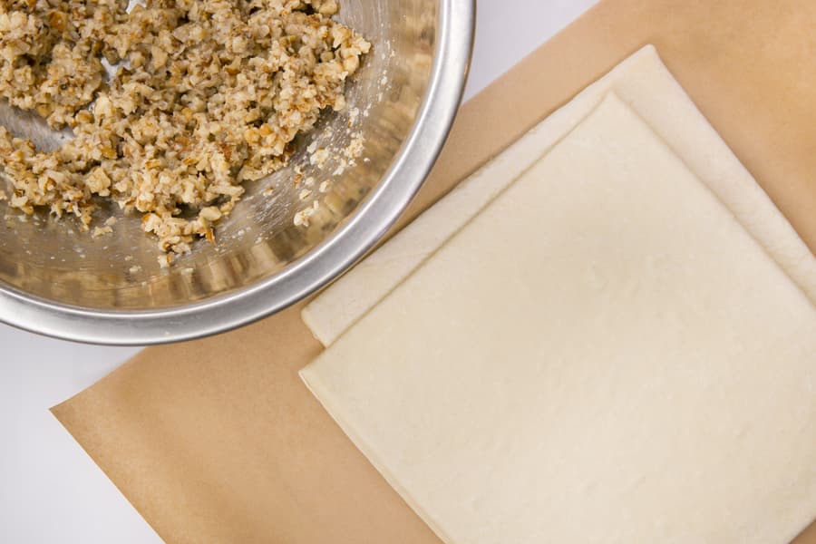 Ингредиенты: 500 г слоеного бездрожжевого теста, 150 г грецких орехов, 2 ст. л. сахара, щепотка корицы и одно яйцо