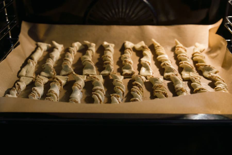 Разрезали заготовку на одинаковые прямоугольники и, сворачивая каждый по спирали, выложили на противень, застеленный пекарской бумагой. Обмазали будущие слойки яичным желтком и поставили емкость в духовку, предварительно разогретую до 220 °C в режиме верх+низ.