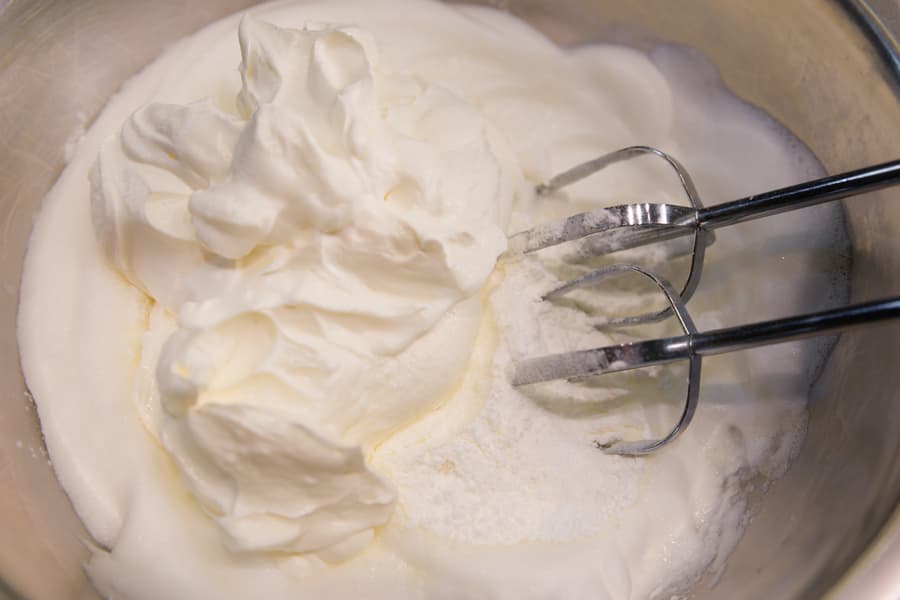 В миску отправили белки с двумя видами сахара (обычного и ванильного) и взбили до средних пиков. Добавили крахмал и сметану и снова взбили на невысокой скорости.