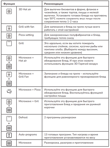 - Microwave + Grill Fan — для одновременного запекания и приготовления блюда на гриле