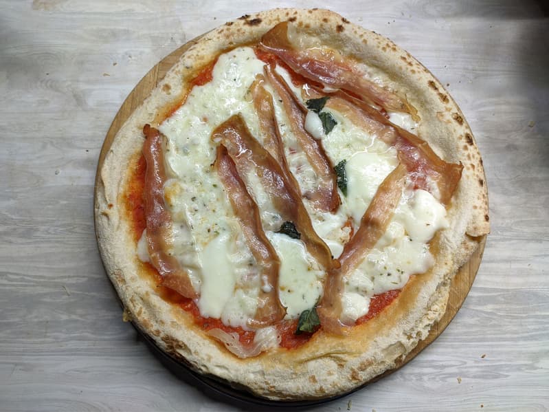 Первая пицца готовилась 7 минут на 180 градусах (с предварительным прогревом), вторая — 10 минут на тех же 180 градусах.