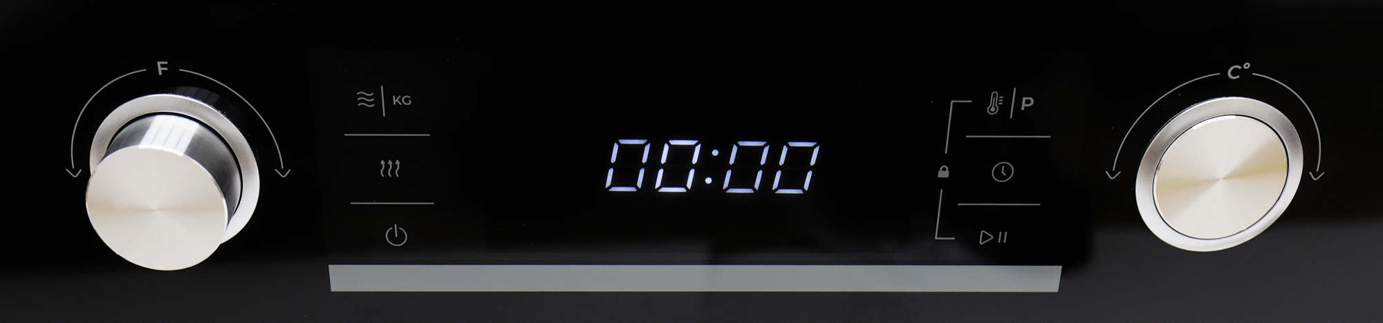 Блок управления духовым шкафом состоит из трех элементов: двух поворотных переключателей и дисплея с сенсорными кнопками.