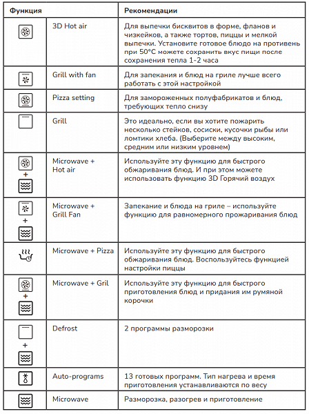 У нашей духовки имеется 11 различных режимов, каждый из которых имеет собственную иконку (в некоторых режимах загораются сразу несколько иконок — например, микроволны+гриль).