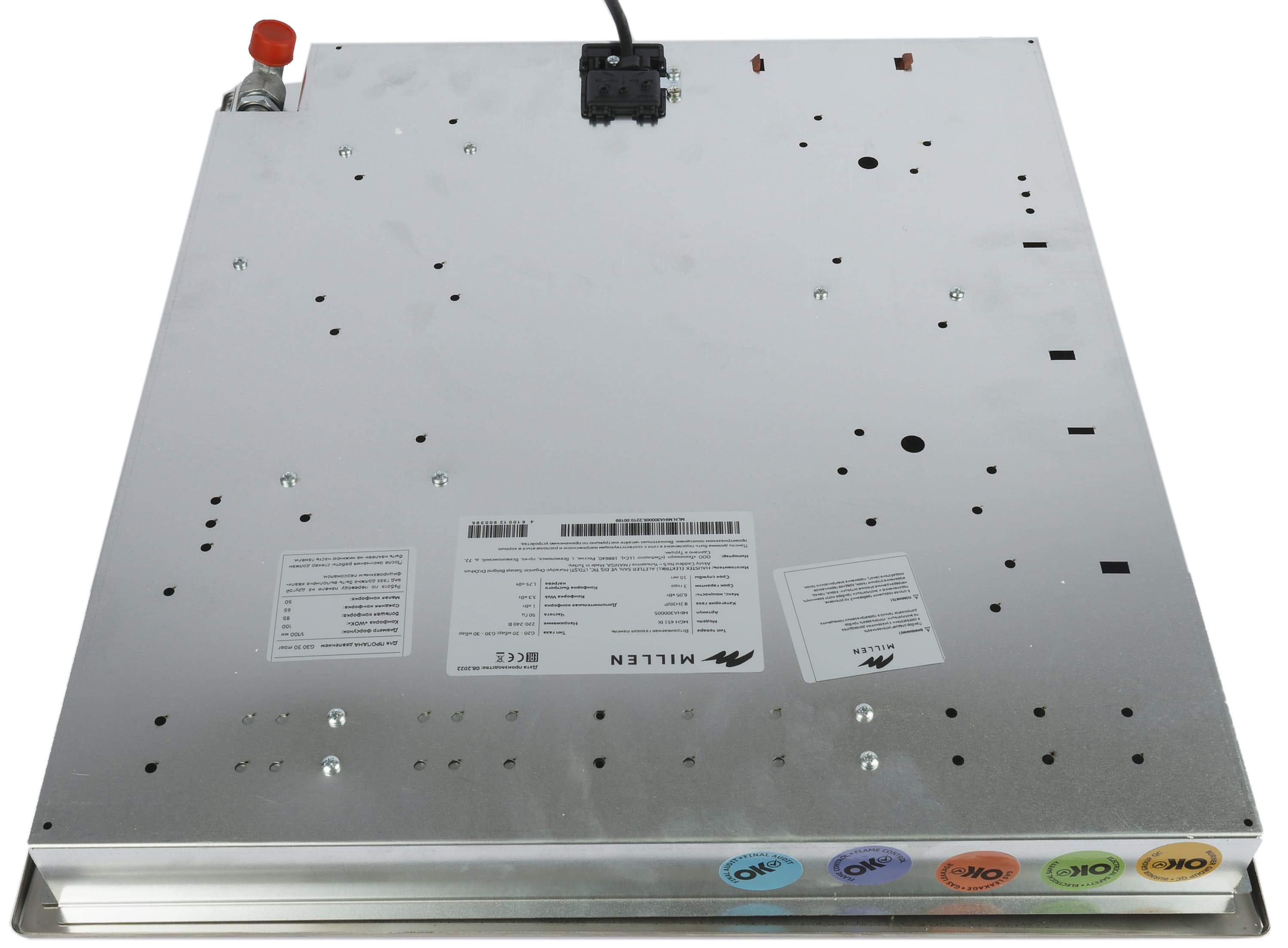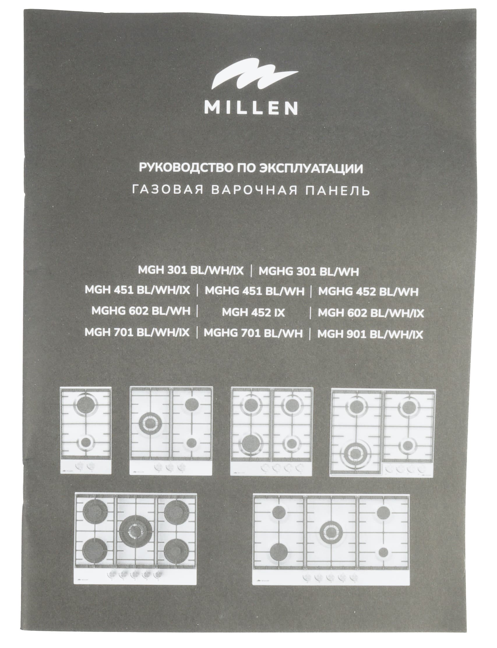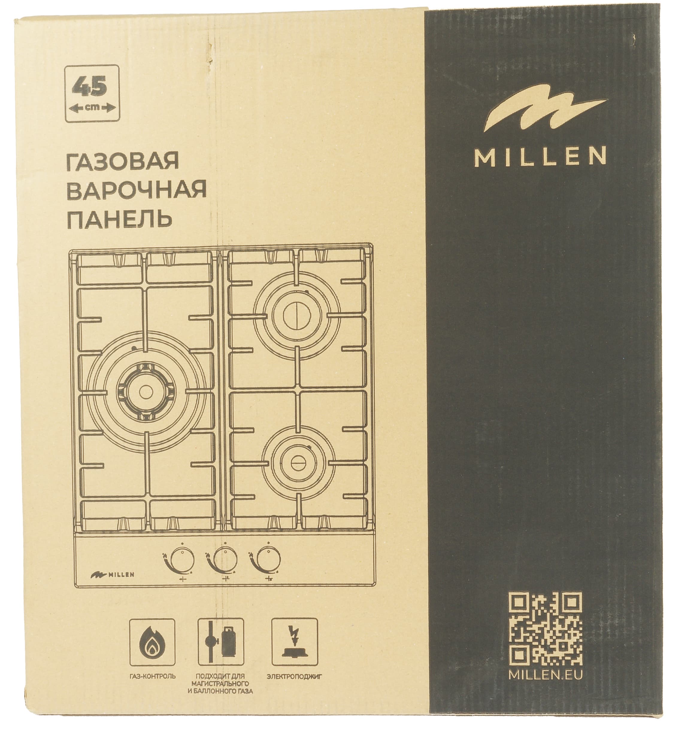 Варочная поверхность Millen MGH 451 IX поставляется в плоской картонной коробке со схематическим изображением устройства, обозначением его трех ключевых особенностей и QR-кодом ведущим на официальный сайт компании. Внутри плита надежно удерживается в неподвижном состоянии пенопластовыми вкладками.
