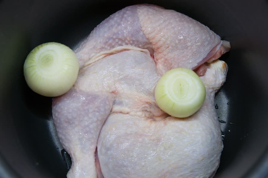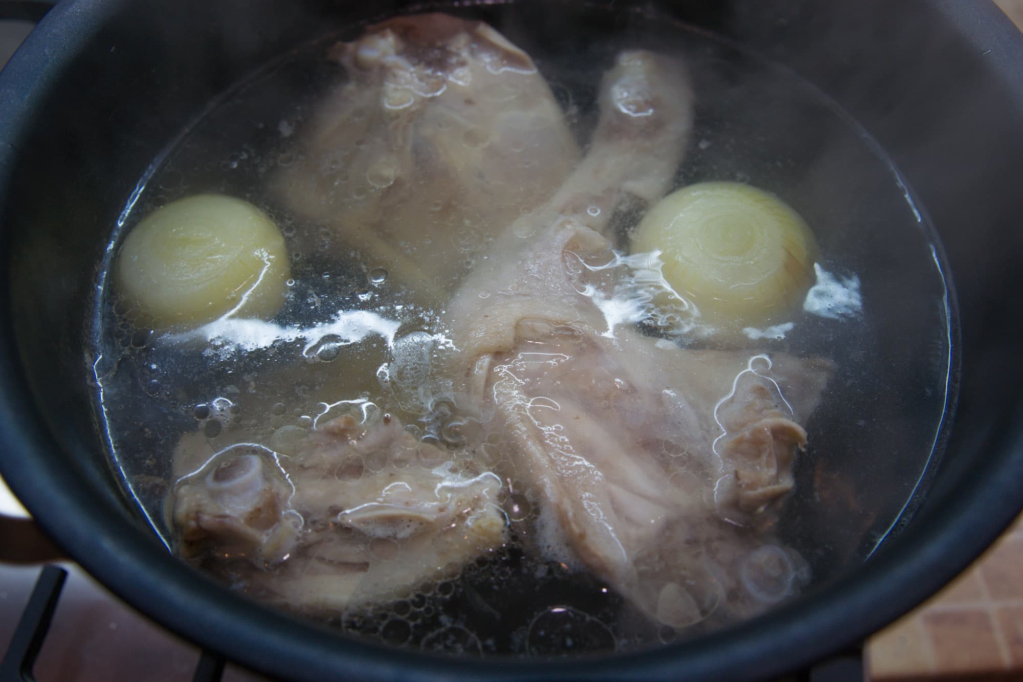 В большую кастрюлю поместили три куриных окорочка, залили их 3 литрами воды, добавили пару луковиц, посолили и поставили на wok-конфорку. Вода в кастрюле с закрытой крышкой закипела за 15,5 минут. Уменьшили огонь до минимума и измерили температуру легкого кипения термометром. Минимум на этой конфорке составлял 95 °C. На средней конфорке и на маленькой минимальная температура составляла 93 °C. Оставили кастрюлю на маленькой конфорке и варили бульон в течение часа.