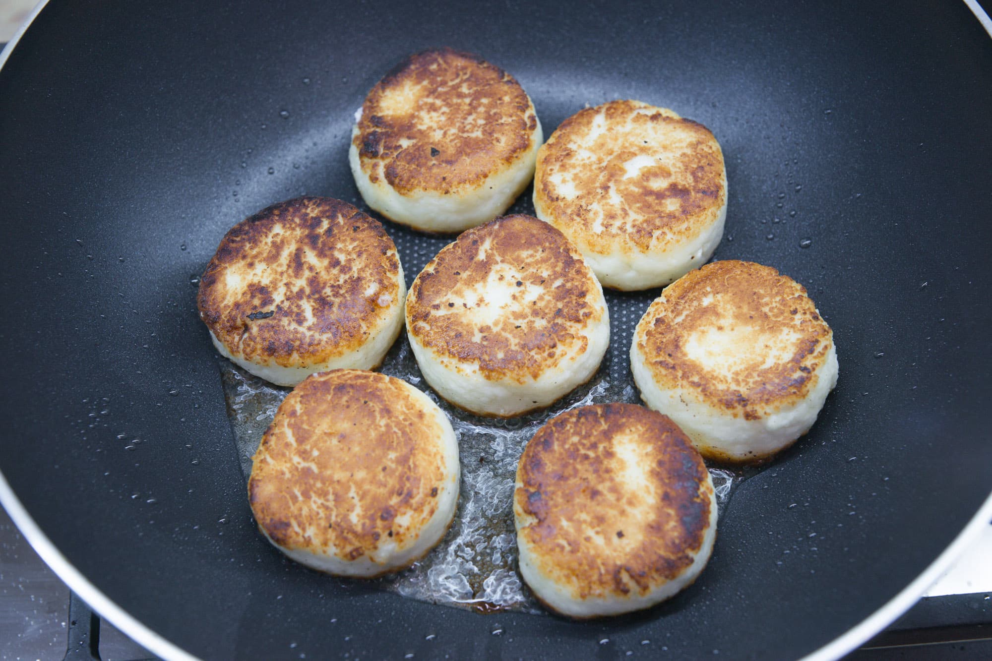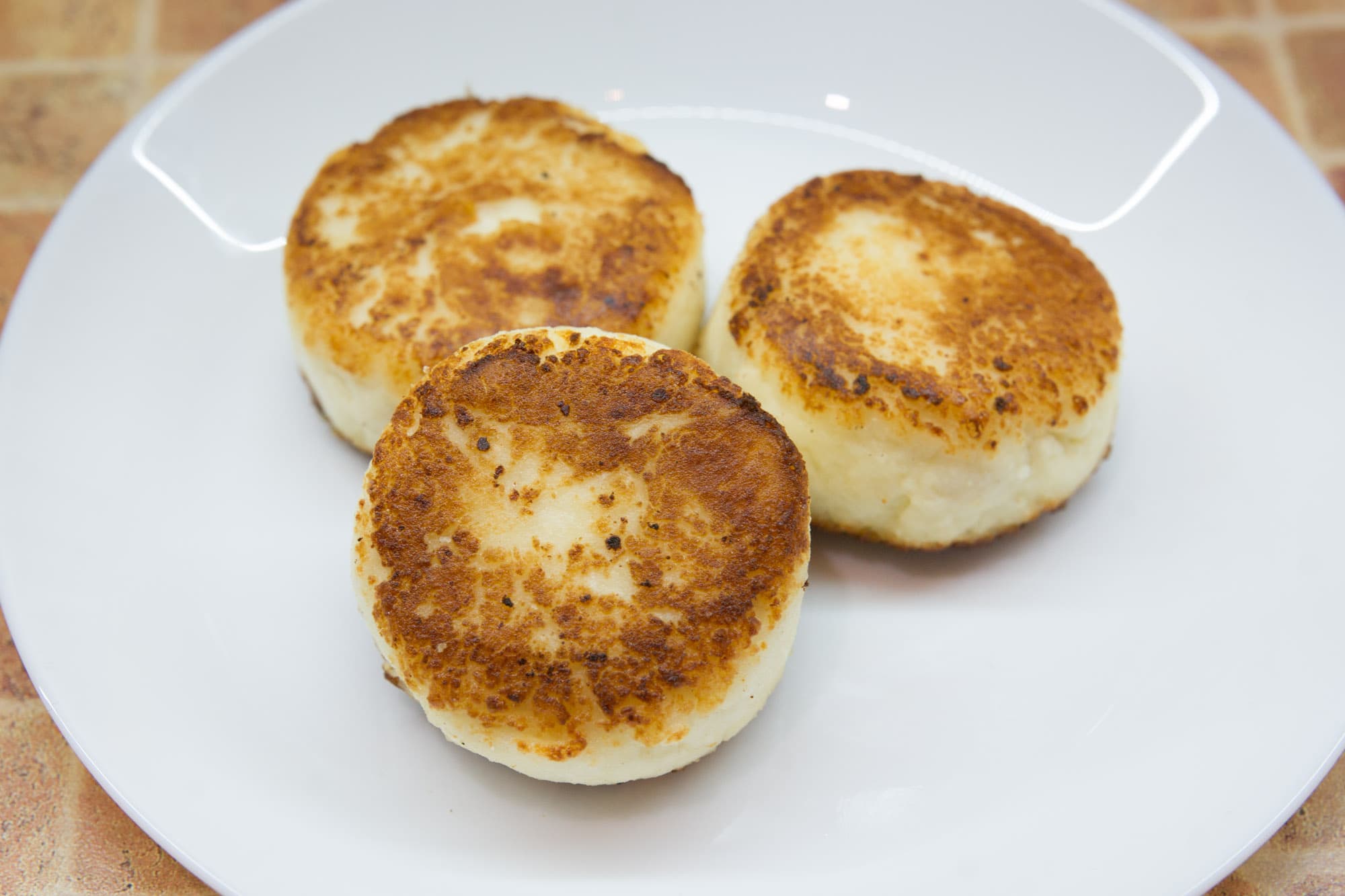 На wok-конфорке разогрели сковороду с небольшим количеством масла и выложили на нее сырники. Оптимальный уровень мощности пламени, позволяющий не сжечь сырники и быстро обжарить их до аппетитной корочки — средний. Пара сырников, которым мы все-таки подпалили края, были выложены на сковороду первыми, и огонь в тот момент еще был максимальным.