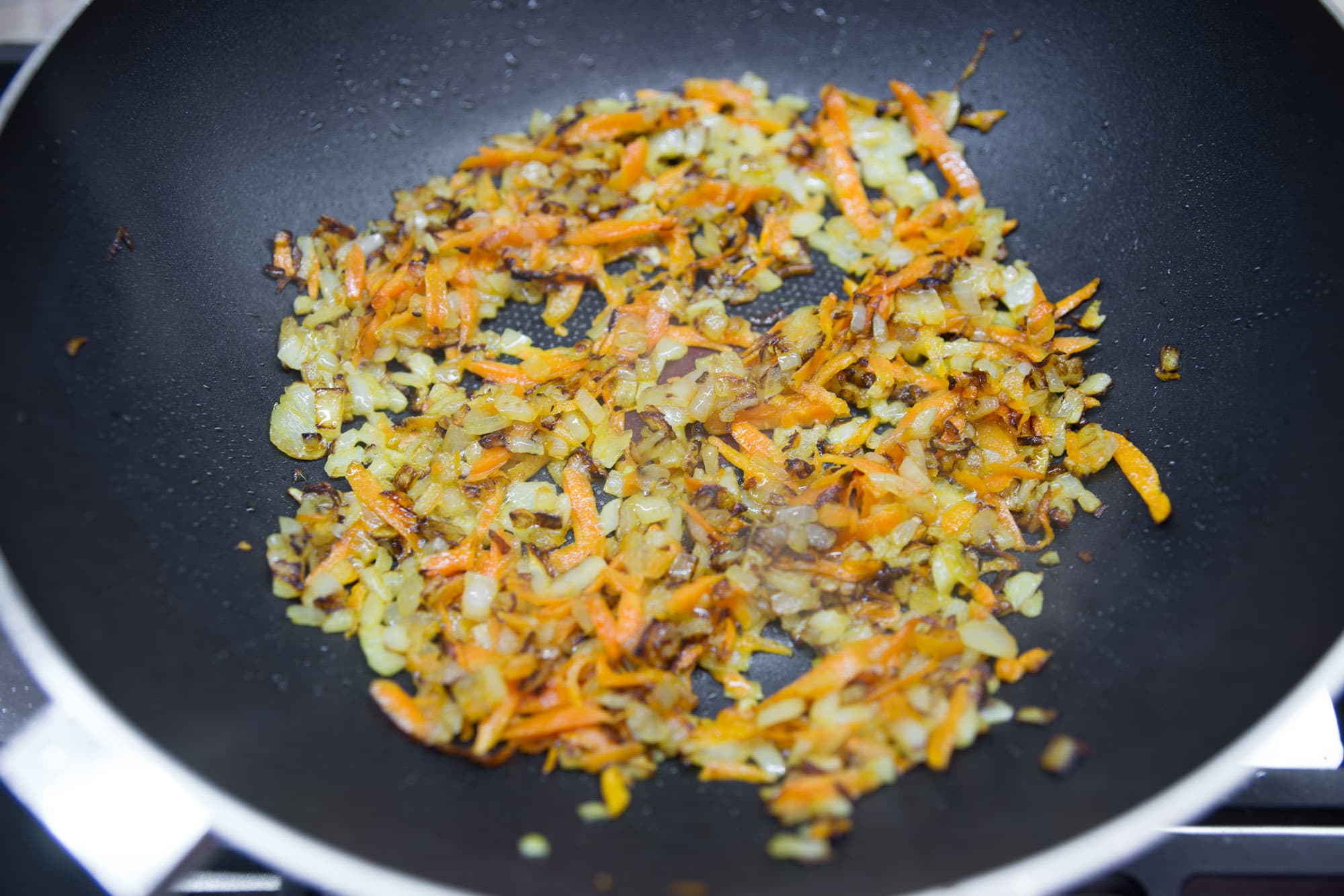 Сначала в большой сковородке на максимальном пламени wok-конфорки мы обжарили лук и морковь до золотистого цвета.