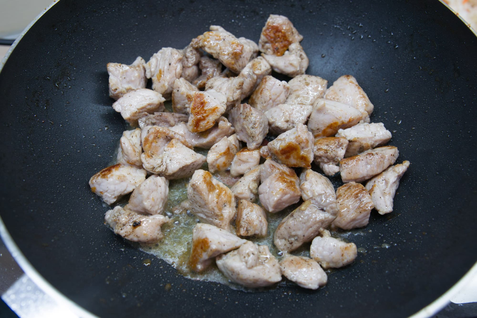 Затем взяли 800 г свиного окорока без жира, нарезали на небольшие кусочки и быстро обжарили также на максимальной мощности.