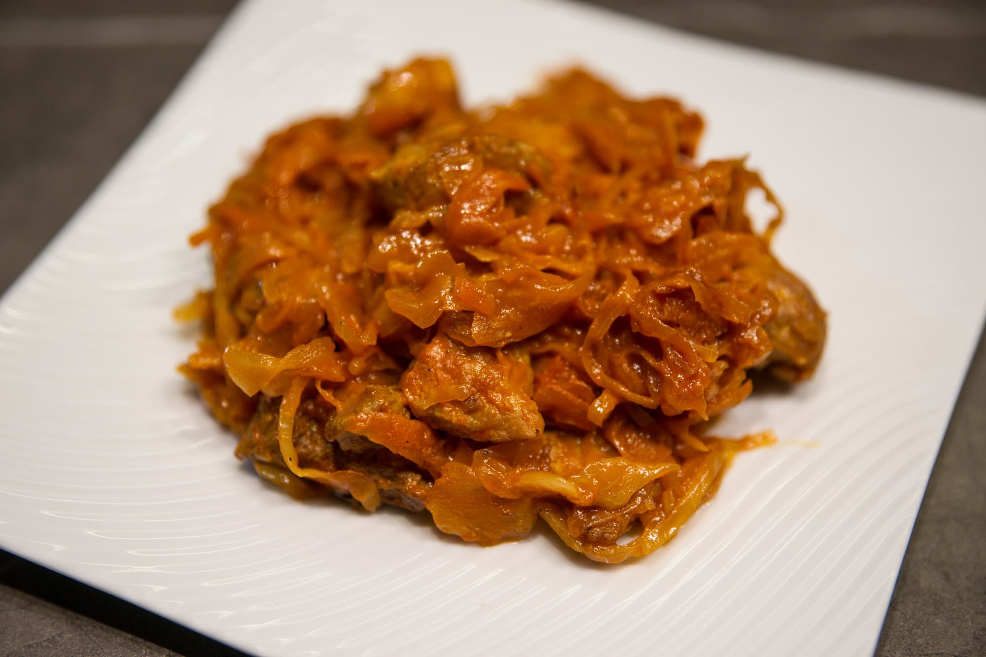 Когда кусочки мяса приобрели симпатичную поджаристую корочку, мы вернули в сковородку лук с морковью, добавили отжатую квашеную капусту, томатную пасту, пару чайных ложек сахара и всё тщательно перемешали. Влили немного воды и уменьшили пламя до минимального уровня. Накрыли крышкой и тушили блюдо в течение 30 минут. Капуста размягчилась, но не превратилась в кашу, а мясо за это время отлично протушилось.