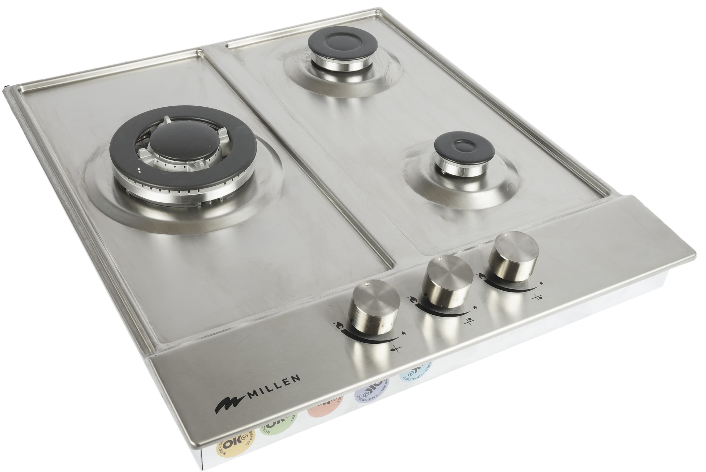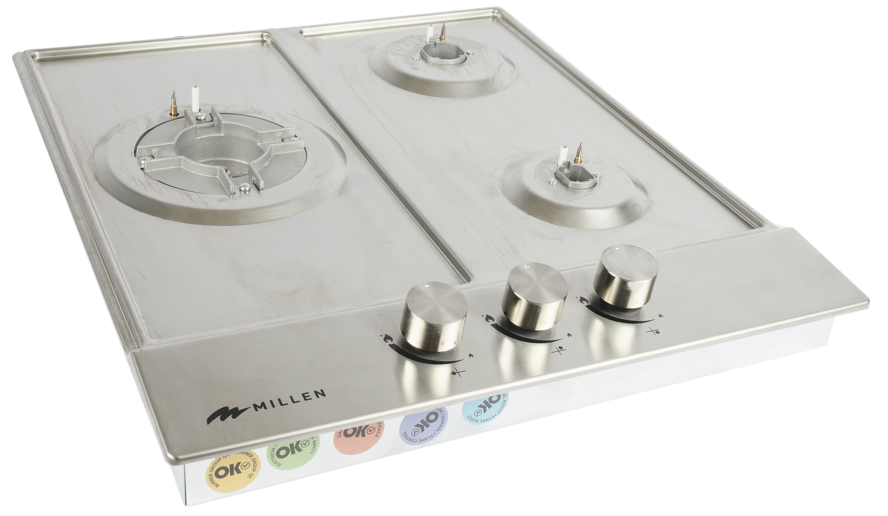 Поверхность встраиваемой газовой панели Millen MGH 451 IX полностью выполнена из нержавейки серебристого цвета.