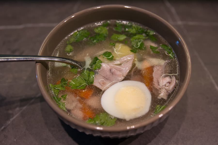 За полчаса до окончания варки добавили в бульон пару картофелин и морковку, а на соседней конфорке сварили яйца.