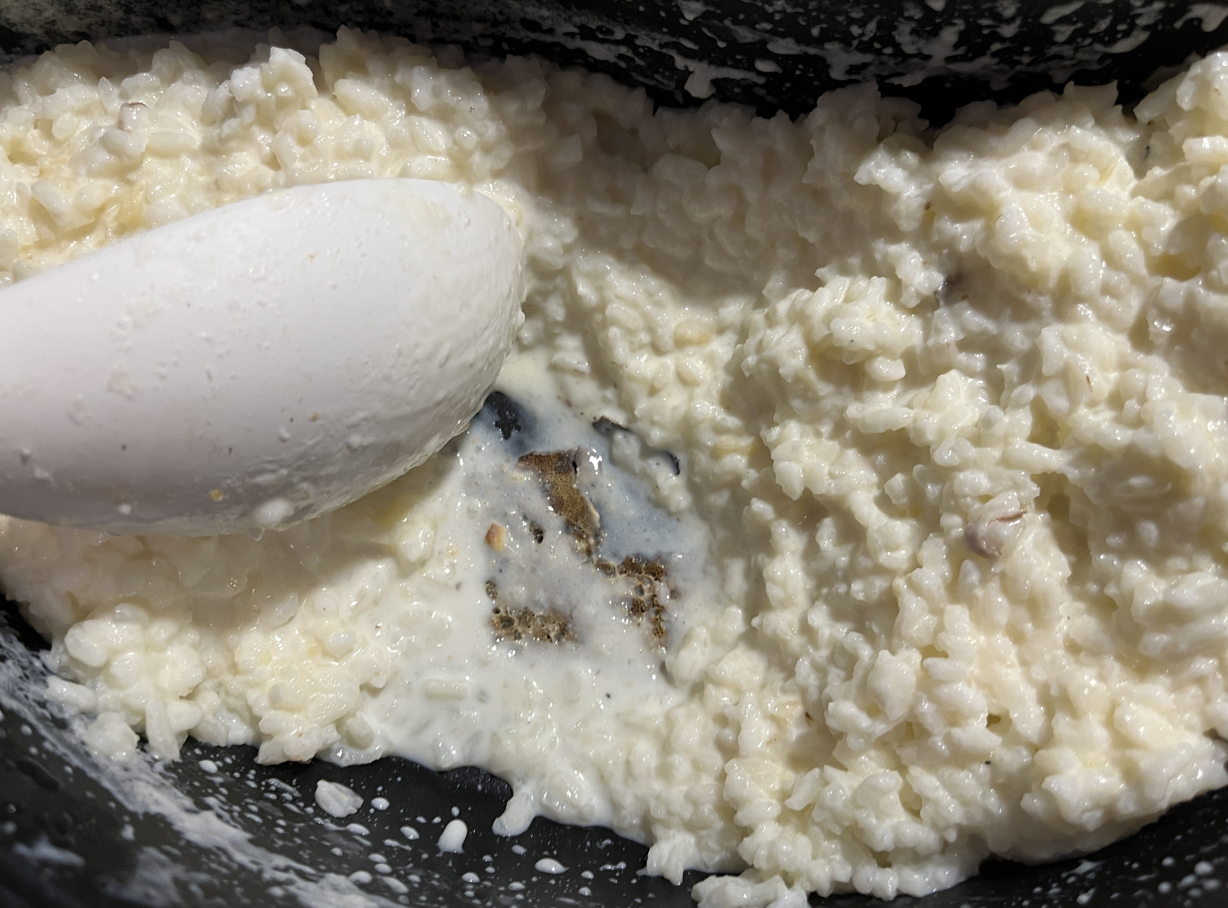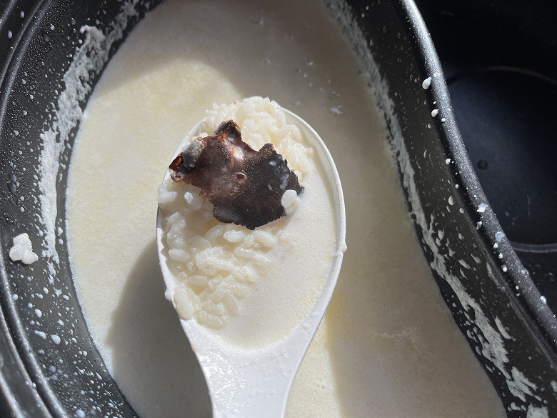 Спустя 15 минут начались первые сложности: молоко в центральной части стало подгорать, образуя корочки на дне. При этом каша даже не доходила до кипения, а рис только начал размягчаться.
