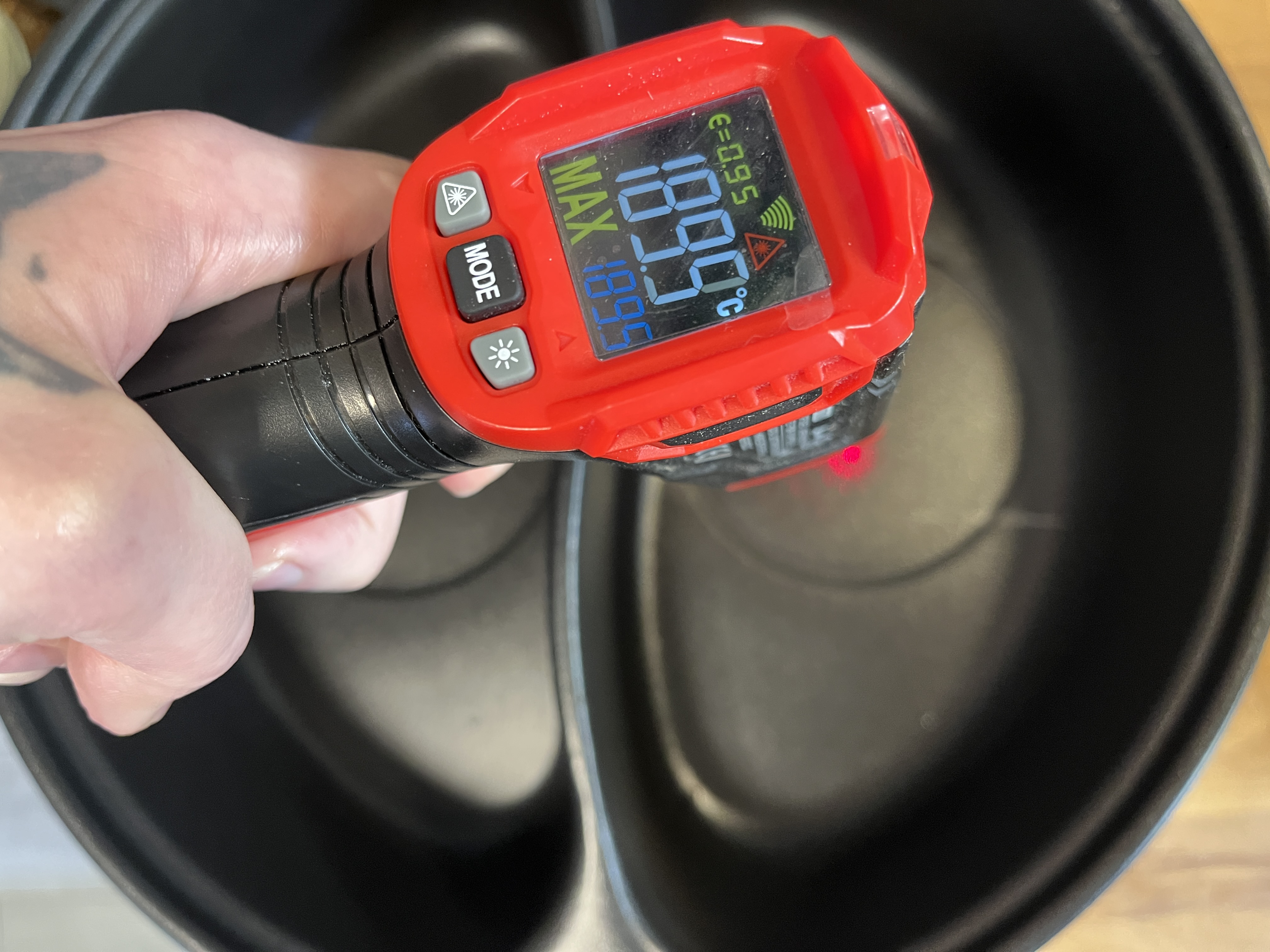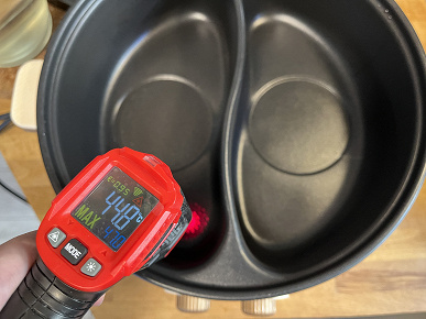 С помощью инфракрасного термометра мы также измерили температуру в обоих отсеках и выяснили, что левая чаша в центральной части нагревается примерно на 50 °C сильнее.
