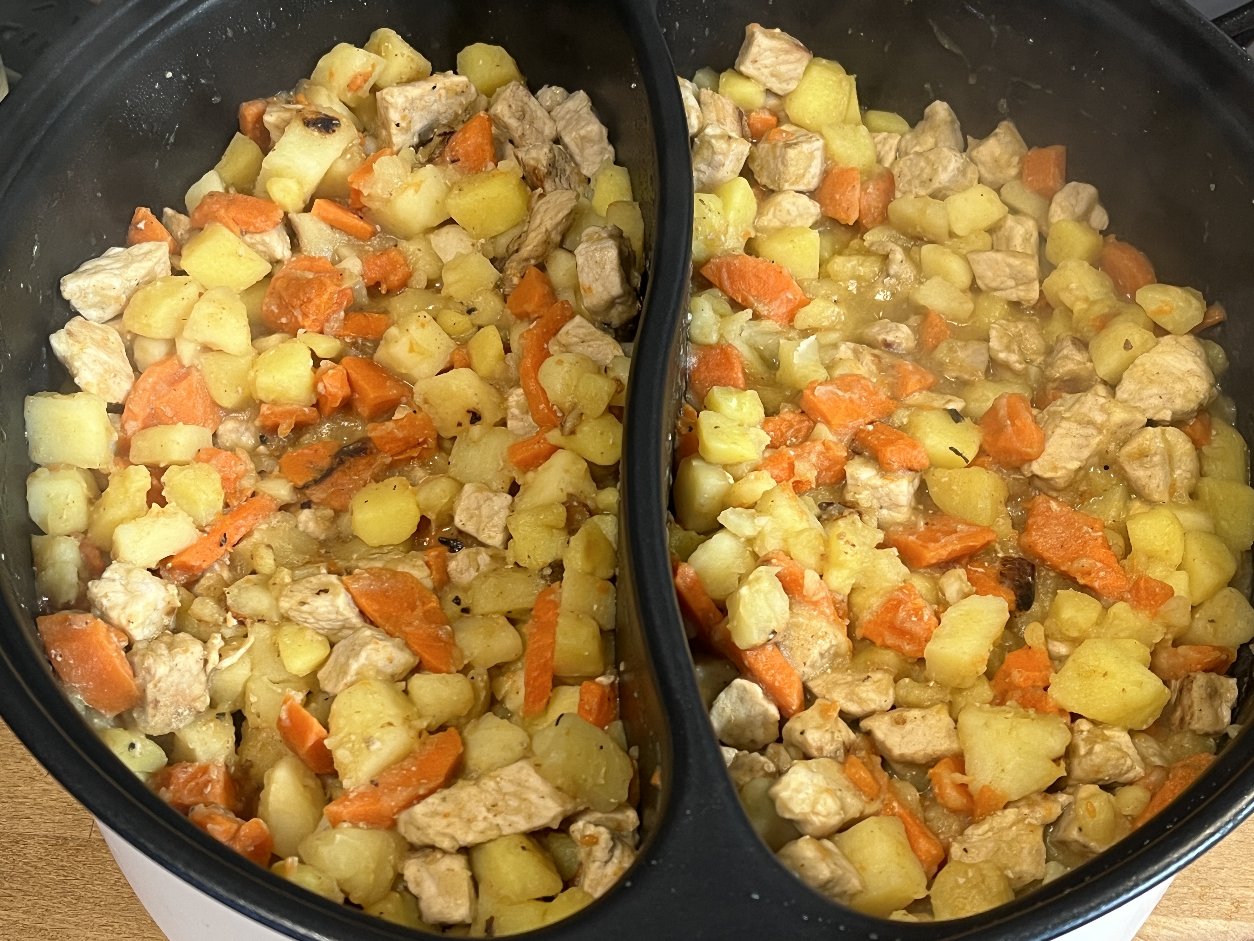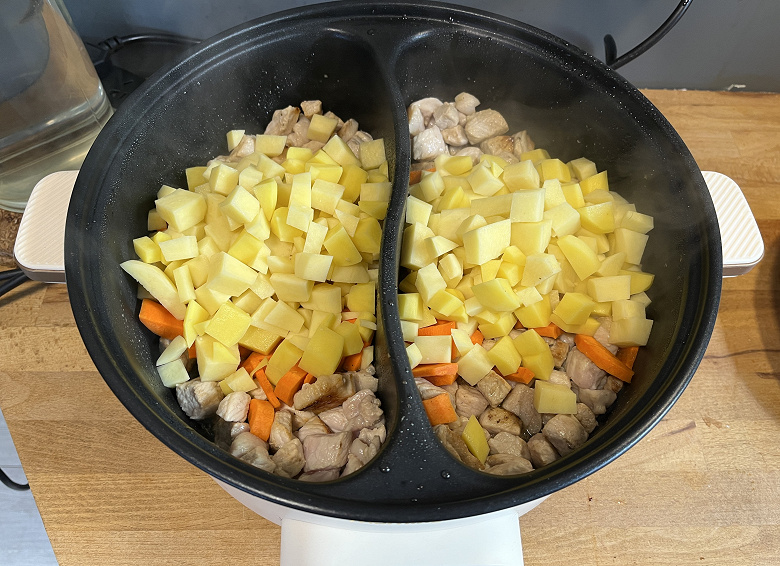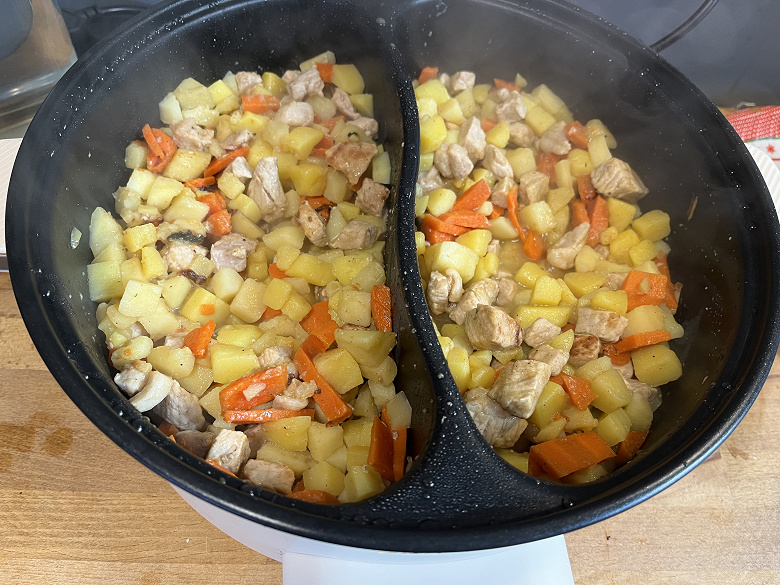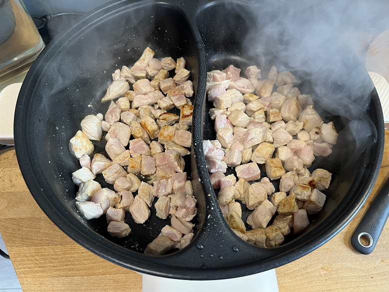 Добавили в наши отсеки растительное масло и принялись за быструю обжарку свинины. Некоторые кусочки, которые чаще попадали в середину, получились более зажаристыми, но ничего критичного в этот раз не случилось.