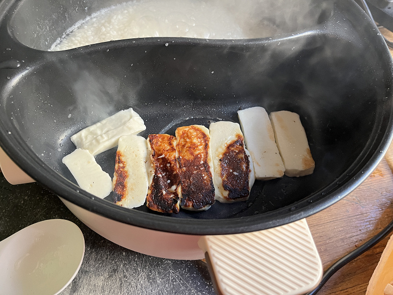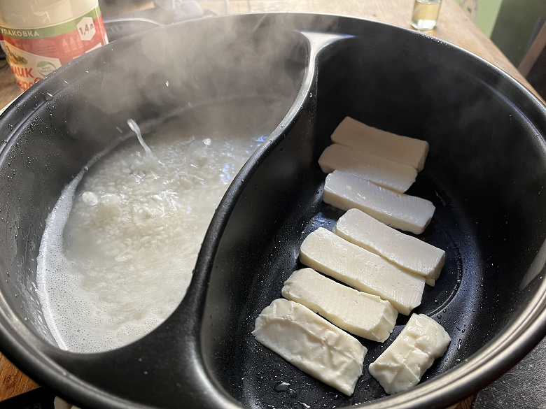 Параллельно с кашей мы занимались обжаркой кусочков сыра халуми.