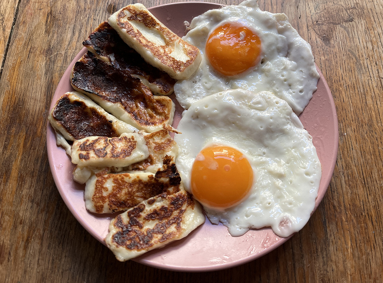 Яичница и жареный сыр халуми