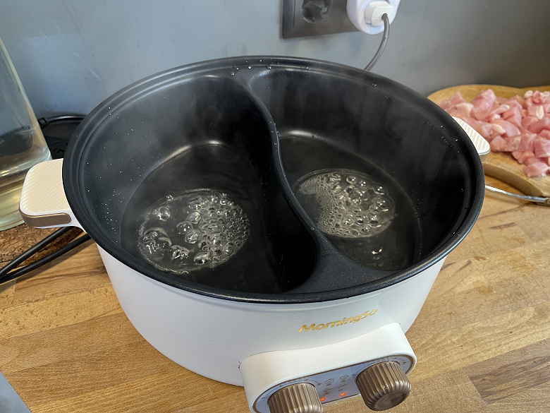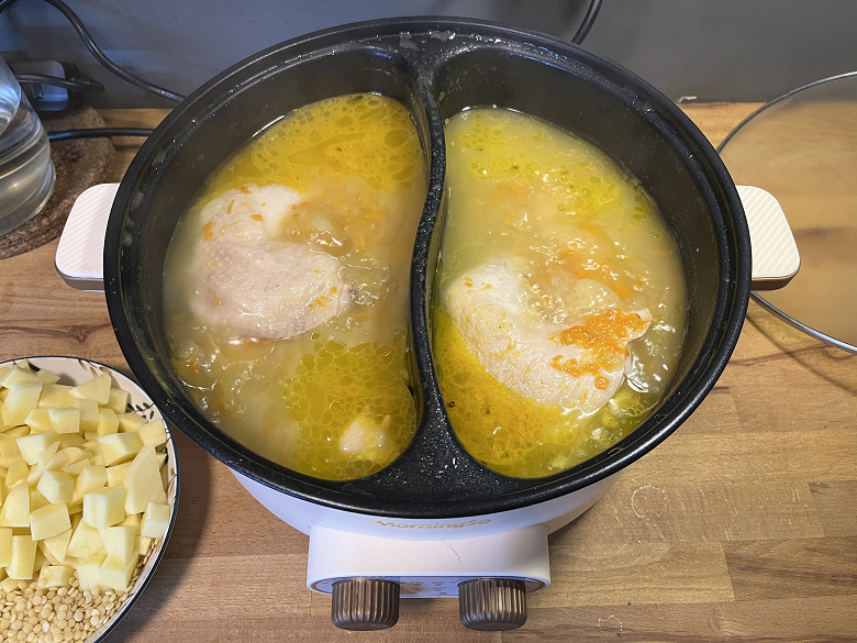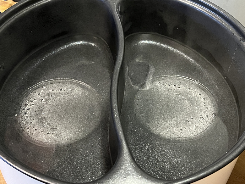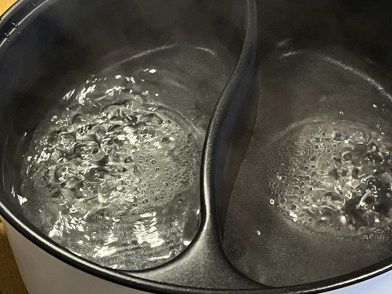 Добавим, что мытье кастрюли тоже не очень удобно. Так как отсеки не съемные, приходится аккуратно заполнять их теплой водой, протирать губкой со средством и несколько раз менять воду, чтобы добиться чистоты. Благодаря антипригарному покрытию вся грязь отмывается легко, но в процессе чувствуешь себя так, как будто моешь посуду в тазу на речке. Выливать воду при мытье или переливать суп в другую емкость, чтобы убрать в холодильник — это тоже квест, так как надо сделать это аккуратно, чтобы жидкость не брызнула на разъем для провода или на дно прибора, а если выливать жидкость из обоих отсеков одновременно, можно попросту расплескать всё содержимое, так как никакого носика/места слива у кастрюли нет.