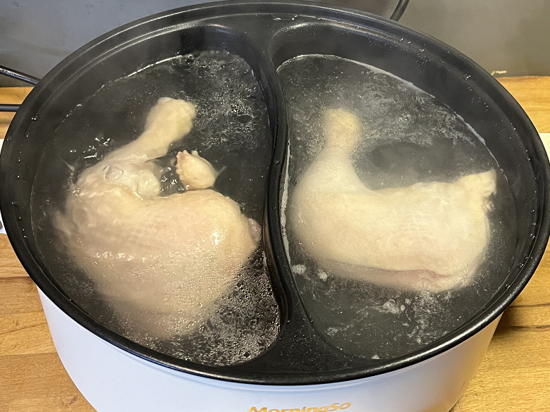 Чтобы у нас не подгорела курица, мы положили окорочка в уже закипевшую подсоленную воду. А сразу после этого уменьшили режим до минимального и накрыли кастрюлю крышкой.