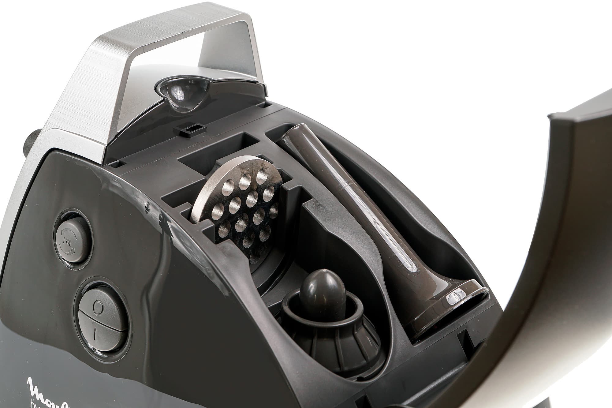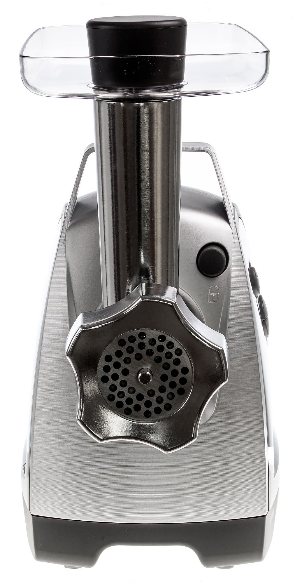 В верхней части мы видим ручку, которая значительно облегчает переноску блока с места на место. Там же находится отсек для аксессуаров. В нем свободно размещаются: незанятая решетка, насадка для кеббе и насадка для изготовления колбас. Отсек для хранения аксессуаров — это довольно важная составляющая удобства при хранении прибора.
