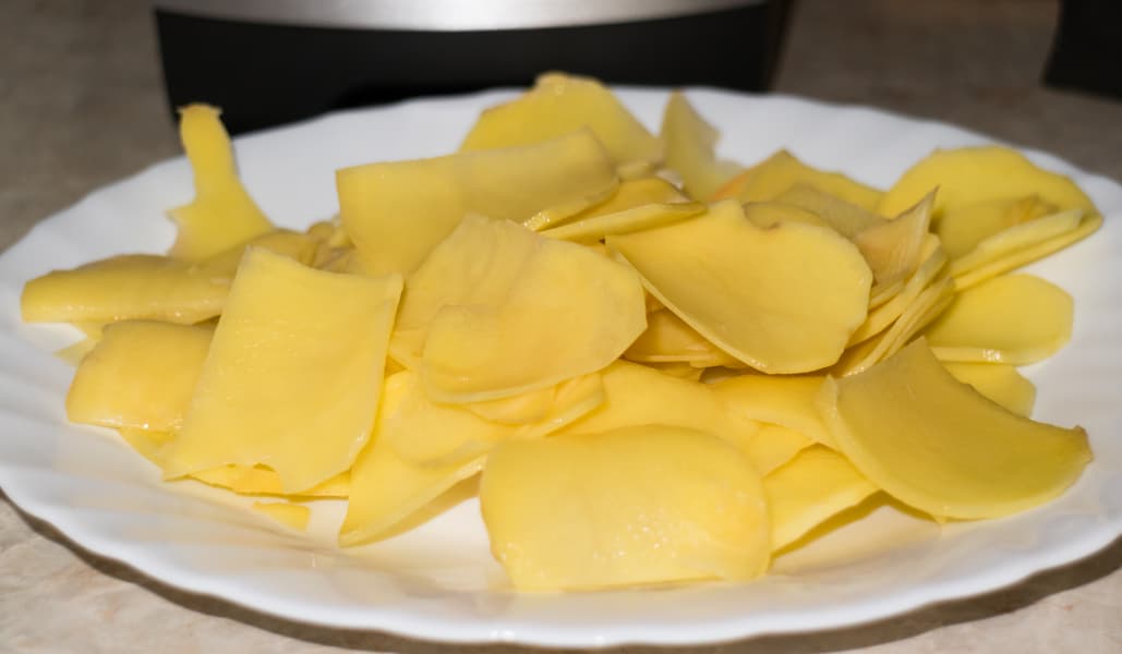 Ломтики ровной толщины, целые, мелких и тонких кусочков очень мало, отходы совсем невелики. Самое важное, что диаметр загрузочного отверстия насадки позволяет использовать среднего размера клубни без разрезания их пополам. В итоге получаются круглые и красивые ломтики картофеля, которые можно не только пожарить, но и пустить, например, на чипсы.