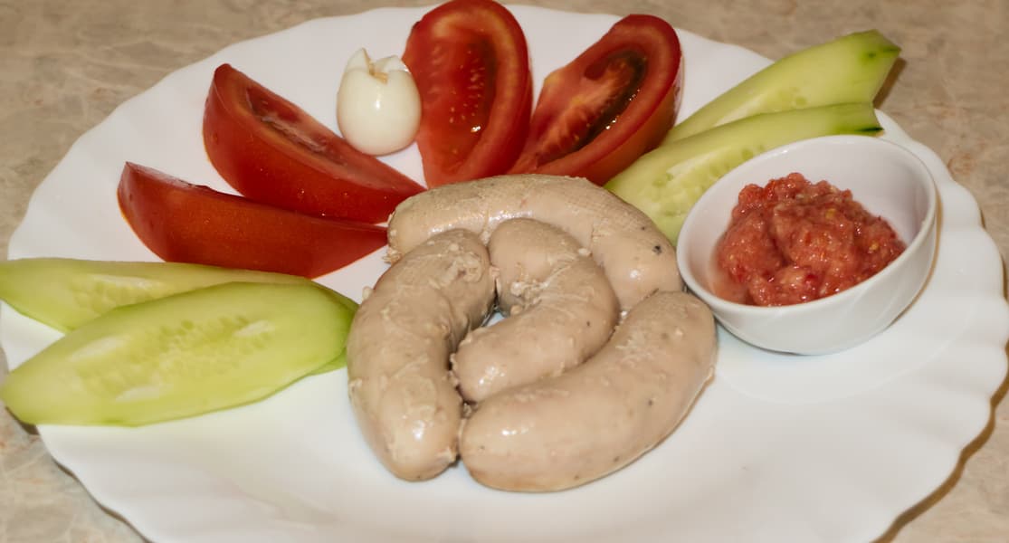 Аккуратно завакуумировали и варили в су-виде на 80 °C в течение часа. Сардельки получились нежные и сочные.